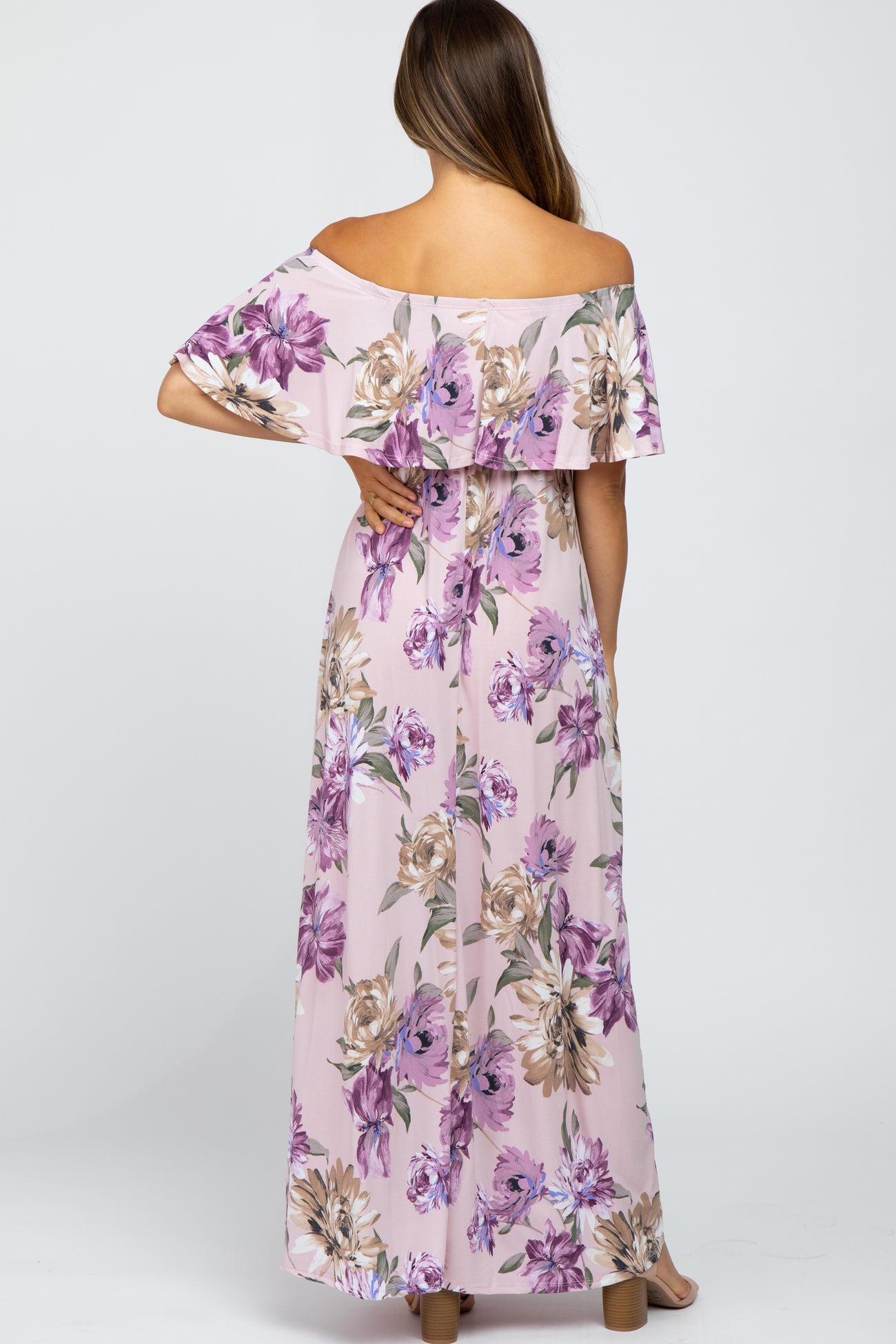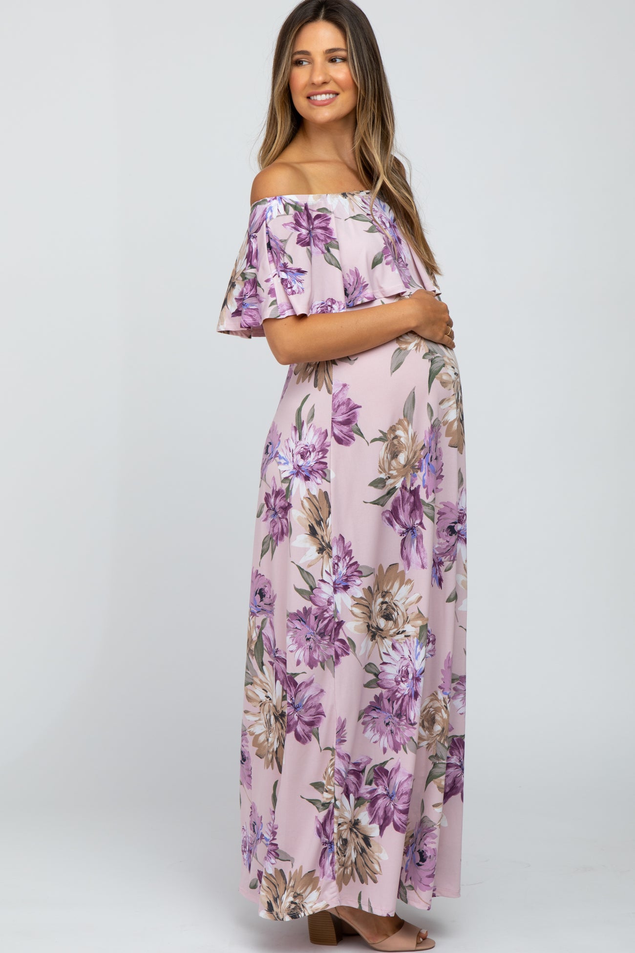 Lavender Floral Flounce Off Shoulder Maternity Maxi Dress