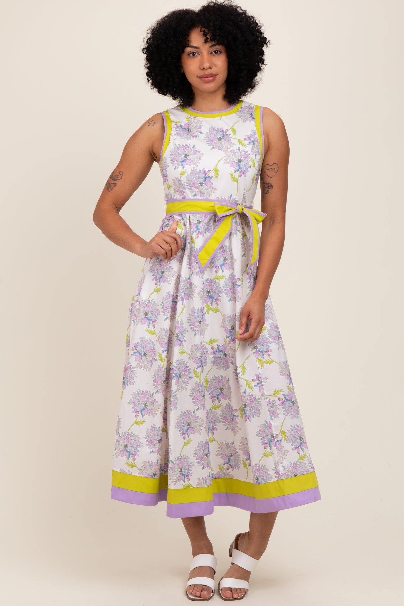 Lavender Floral Sleeveless Sash Tie Midi Dress