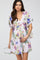 A floral print dress with a v-neckline and rolled cuff short sleeves. Dress is partially lined in skirt.