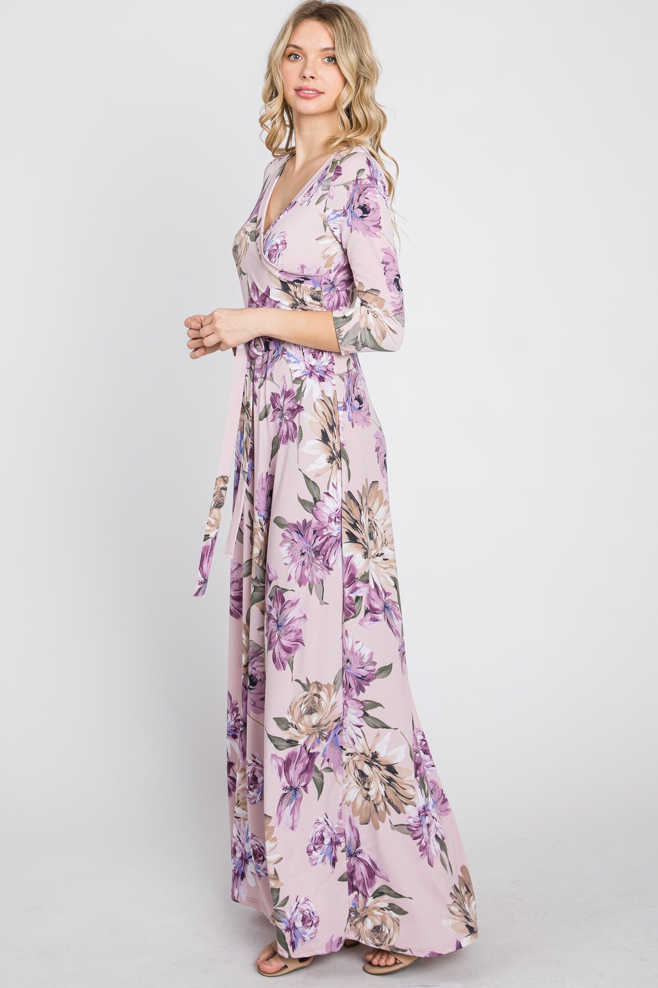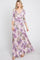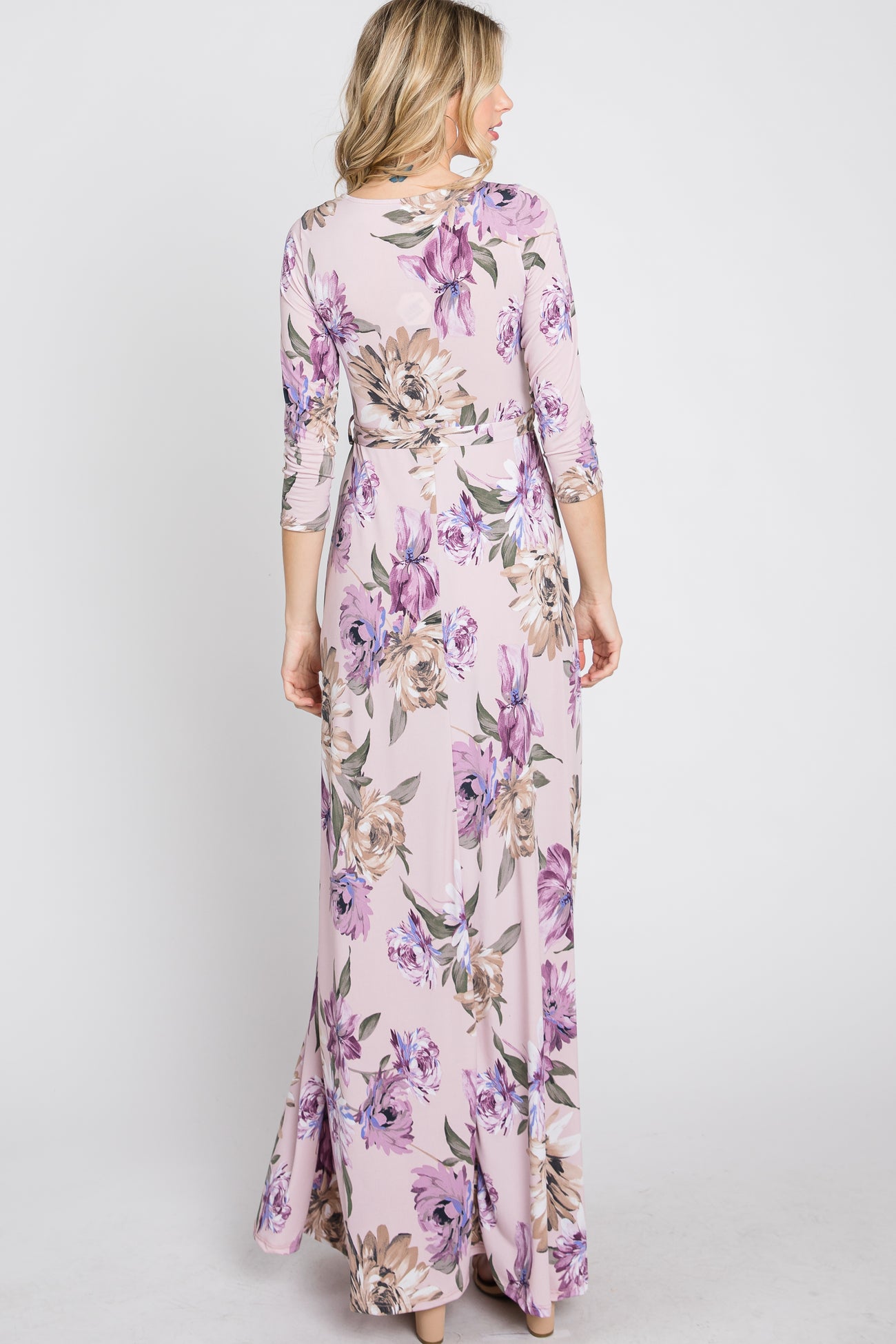 Details A floral maxi dress with a draped neckline and a sash tie. Content + Care