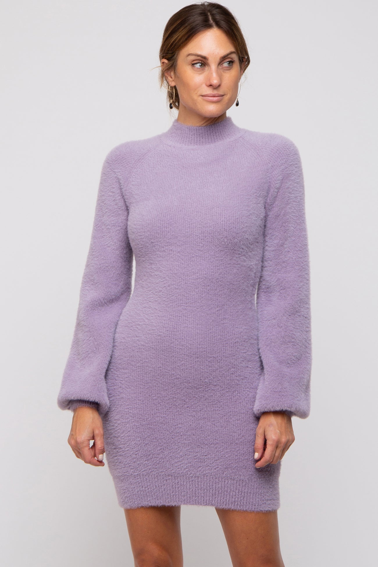 Lavender Fuzzy Knit Puff Sleeve Sweater Dress