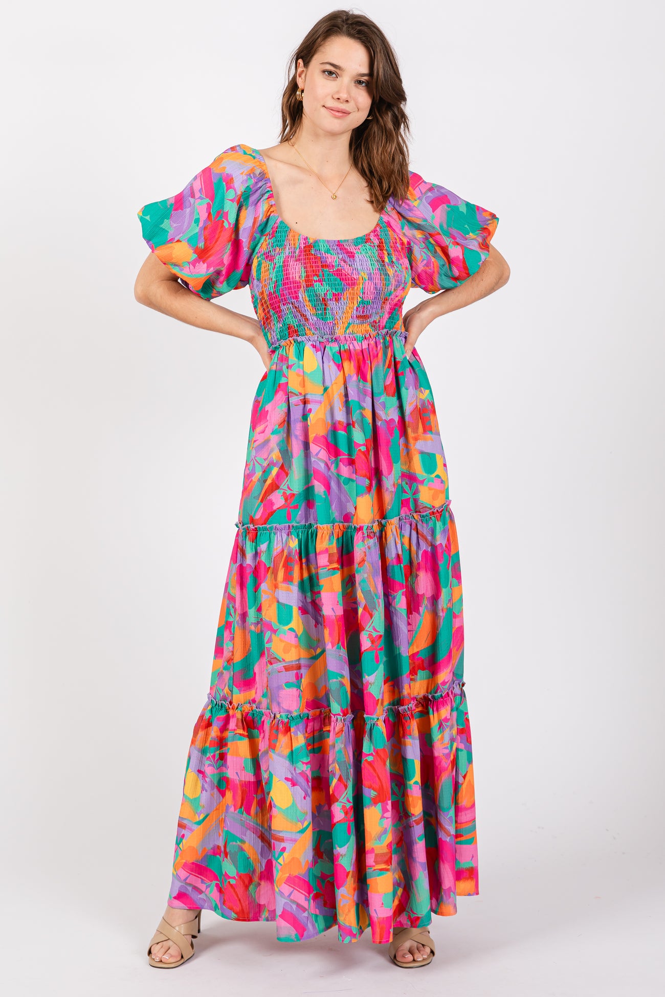 A multi color floral maternity maxi dress featuring short puff sleeves, a smocked top, side pockets, tiered skirt and a square neckline.