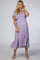 A solid maternity dress with a v-neckline, smocked elastic bust, and ruffle accents. Double lined.