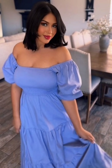 A solid hued maxi dress featuring a smocked top, a square neckline, short puff sleeves, side pockets and a tiered skirt.