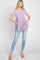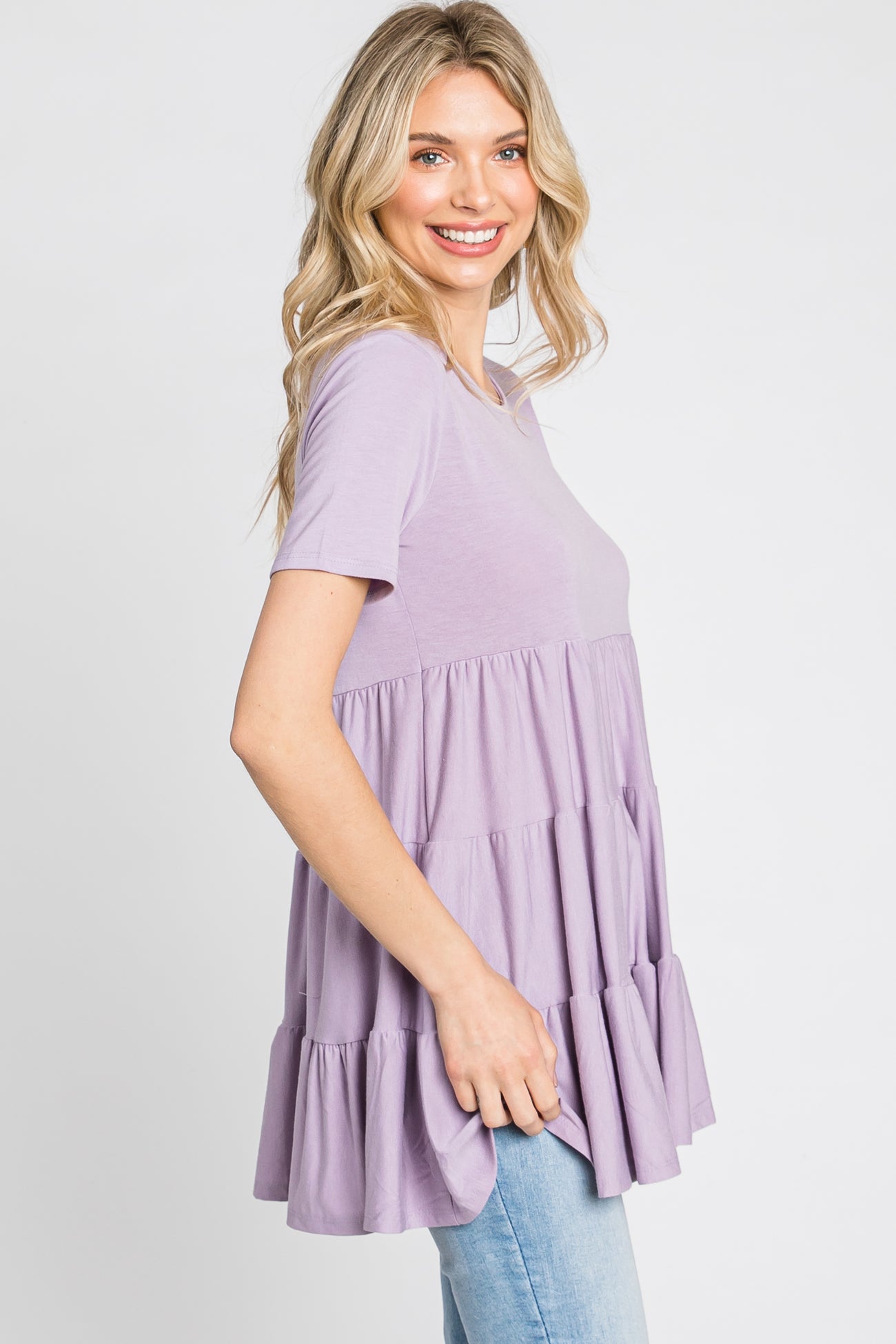 A solid top with gathered tiers, short sleeves, and a rounded neckline.