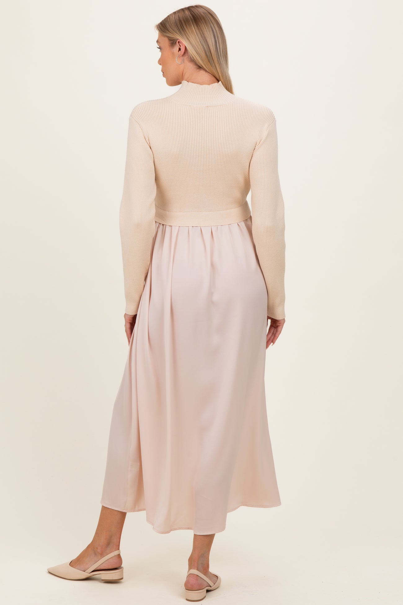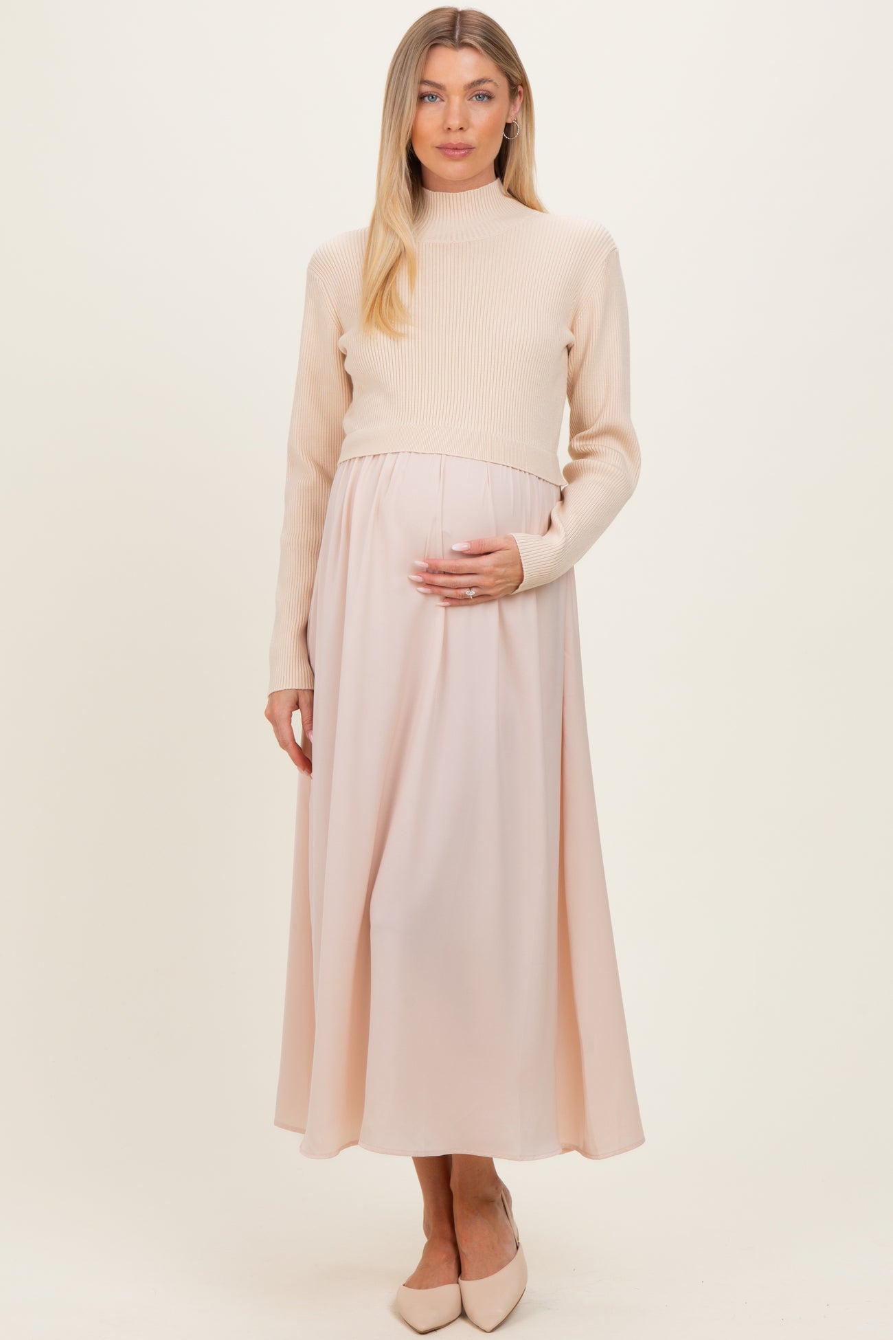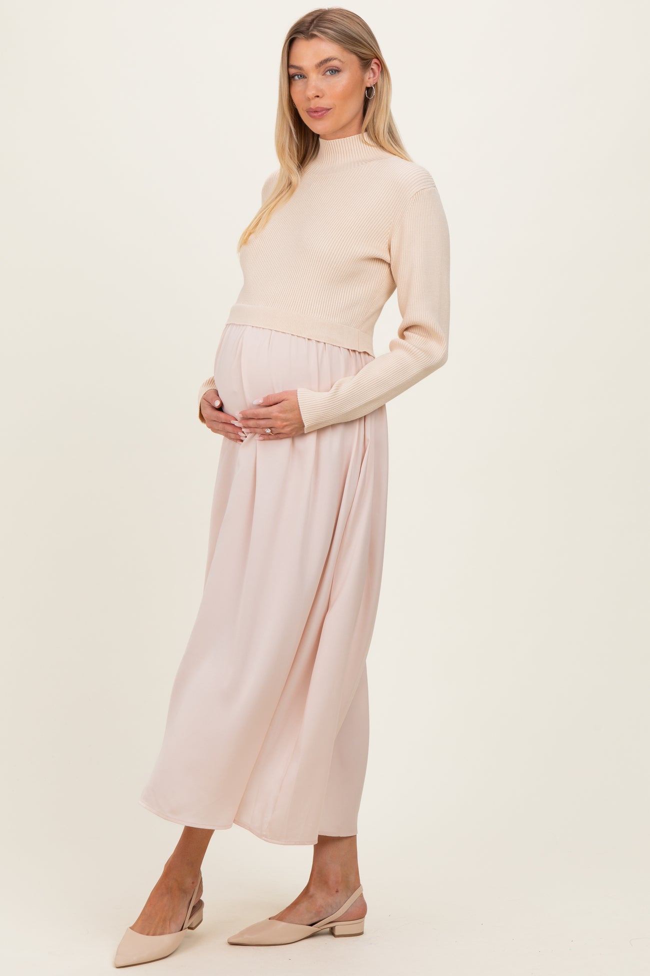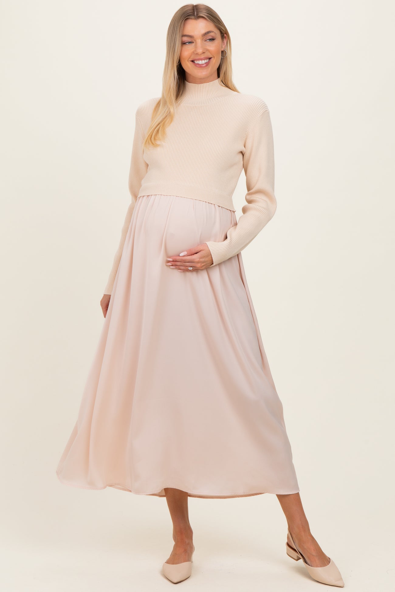 Light Beige Knit Contrast Top Satin Maternity Midi Dress