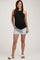 A light wash pair of maternity jean shorts with a fringe hem, light distressing, five pockets and full panel elastic bellyband. Material has little stretch.