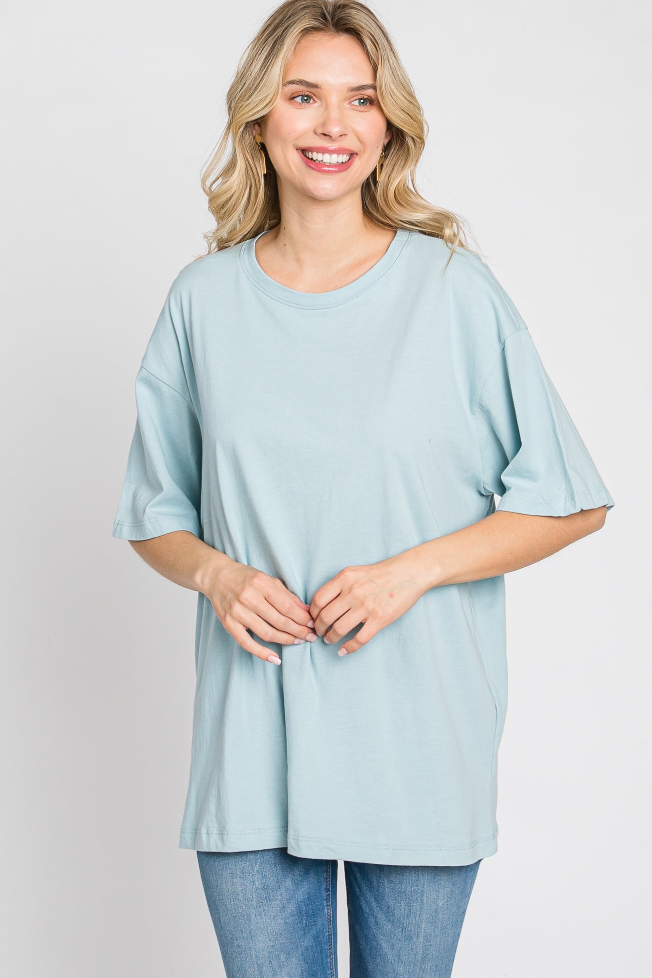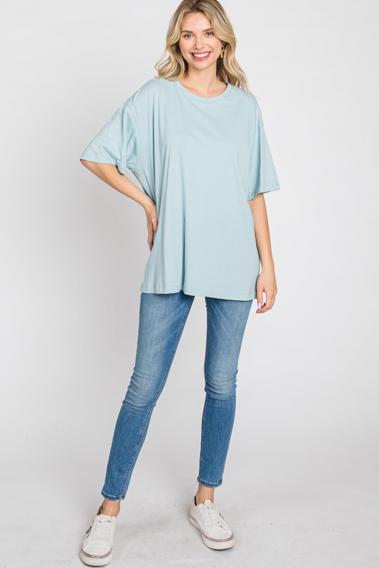 A basic solid tee with an oversized fit, short sleeves, and a rounded neckline.