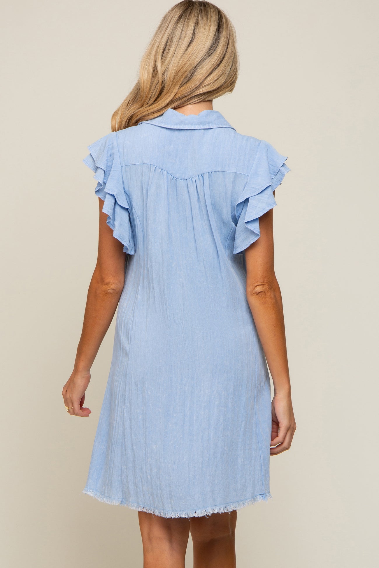 Details A chambray maternity dress featuring a collared neckline, layered ruffle sleeves, a button up front and a raw edge fringe hem. Content + Care