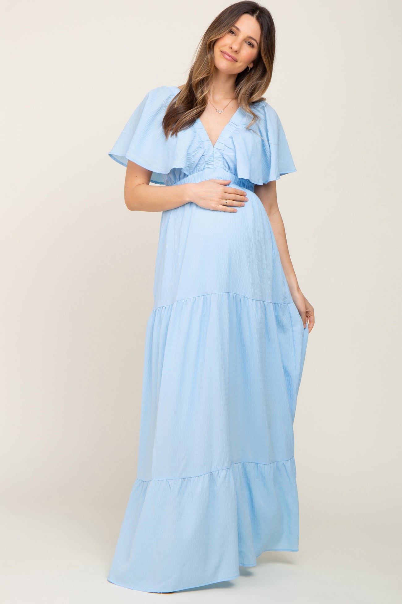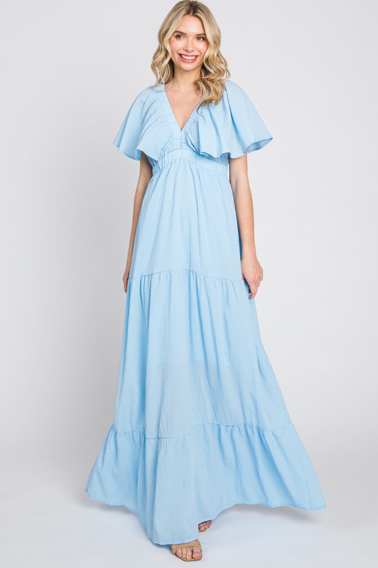 Light Blue Crepe Flounce Sleeve Tiered Maternity Maxi Dress
