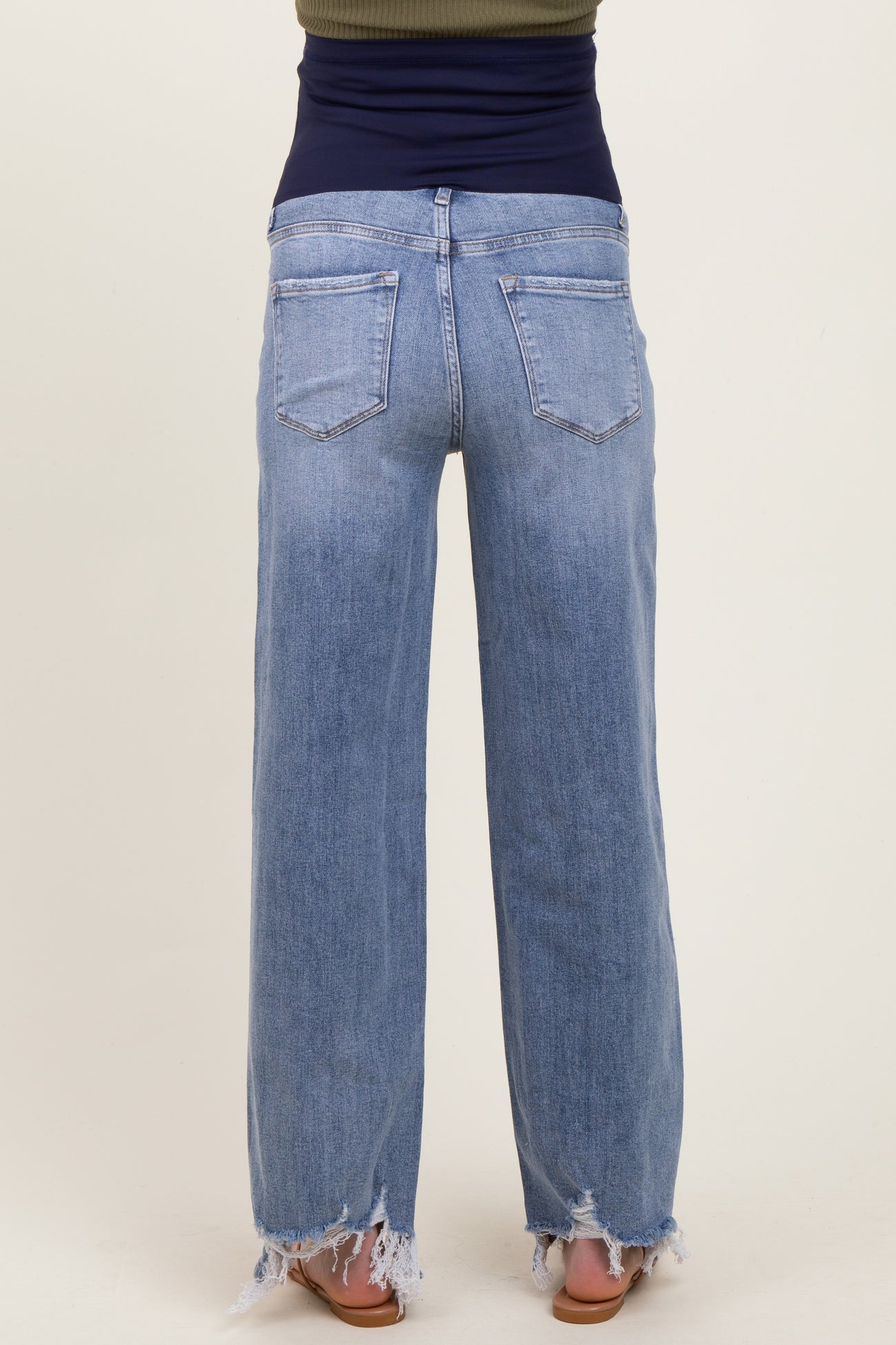 Light Blue Distressed Asymmetrical Fringe Hem Straight Leg Maternity Jeans