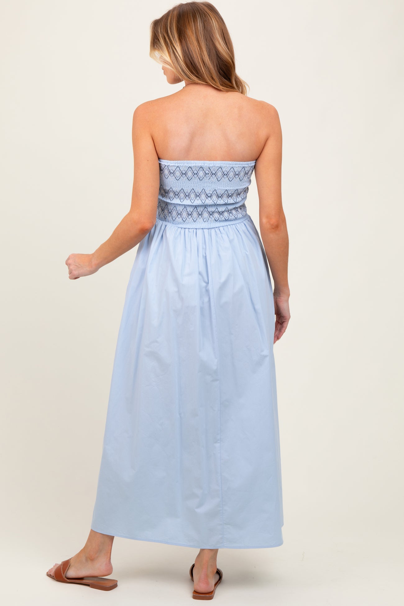 Light Blue Embroidered Strapless Smocked Bodice Flared Maternity Midi Dress