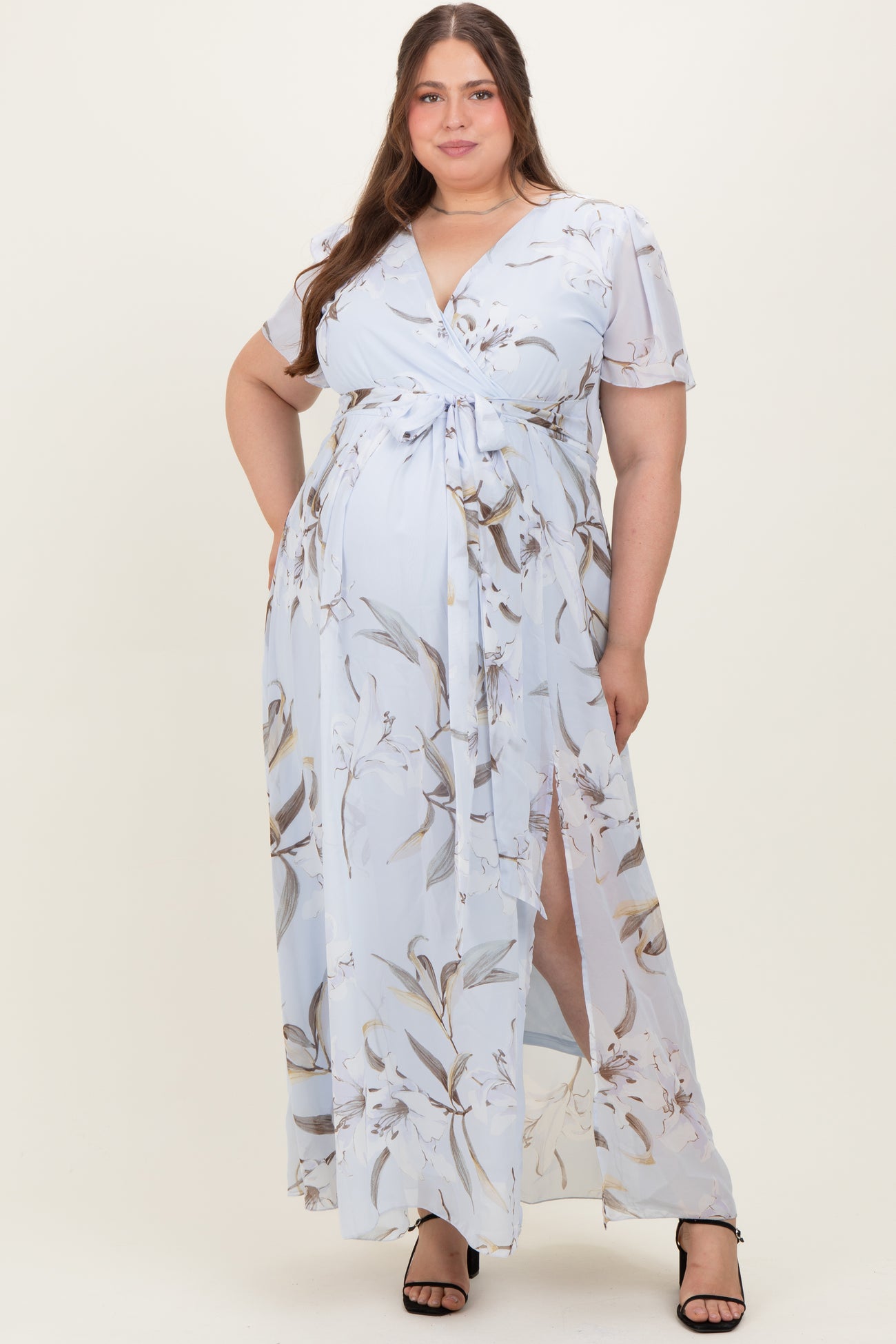 Light Blue Floral Chiffon Sash Tie Maternity Plus Maxi Dress