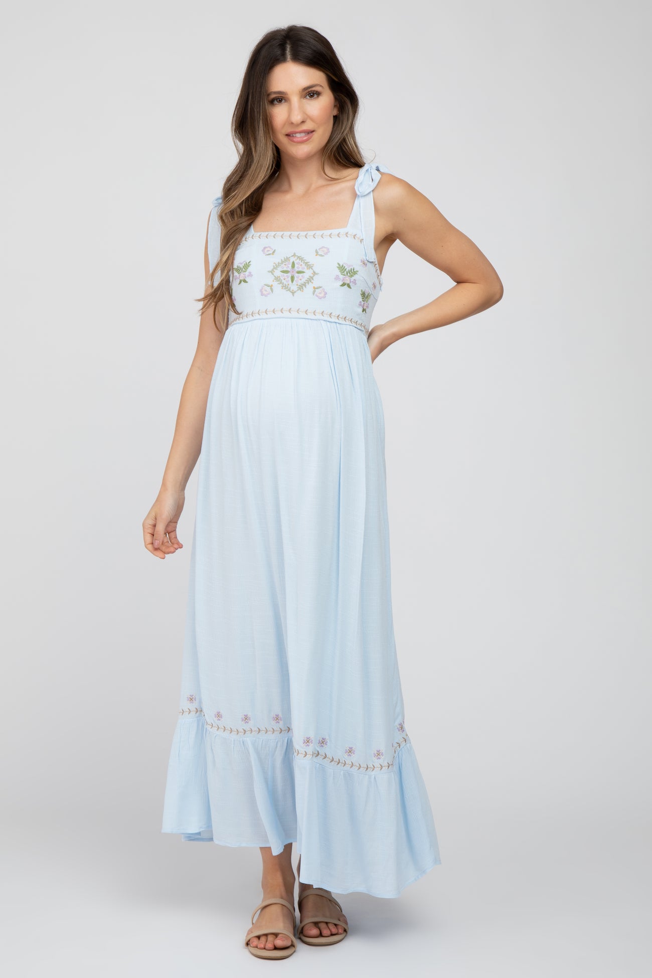 Light Blue Floral Embroidered Sleeveless Maternity Maxi Dress