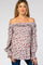 A floral print long sleeve maternity top in an off shoulder style. Features smocked bust and puff ruffle sleeves.