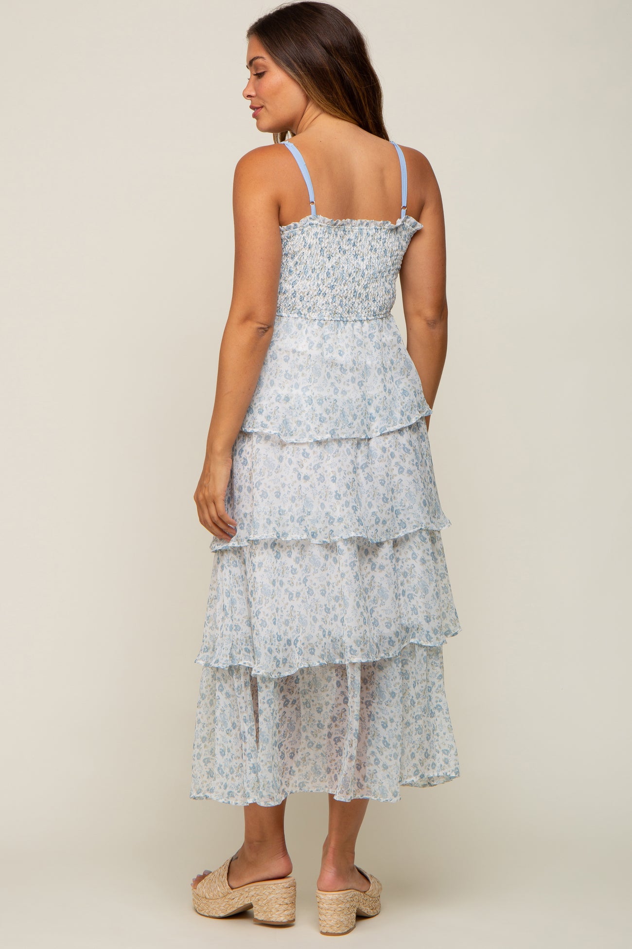 Light Blue Floral Sleeveless Tiered Maternity Maxi Dress