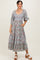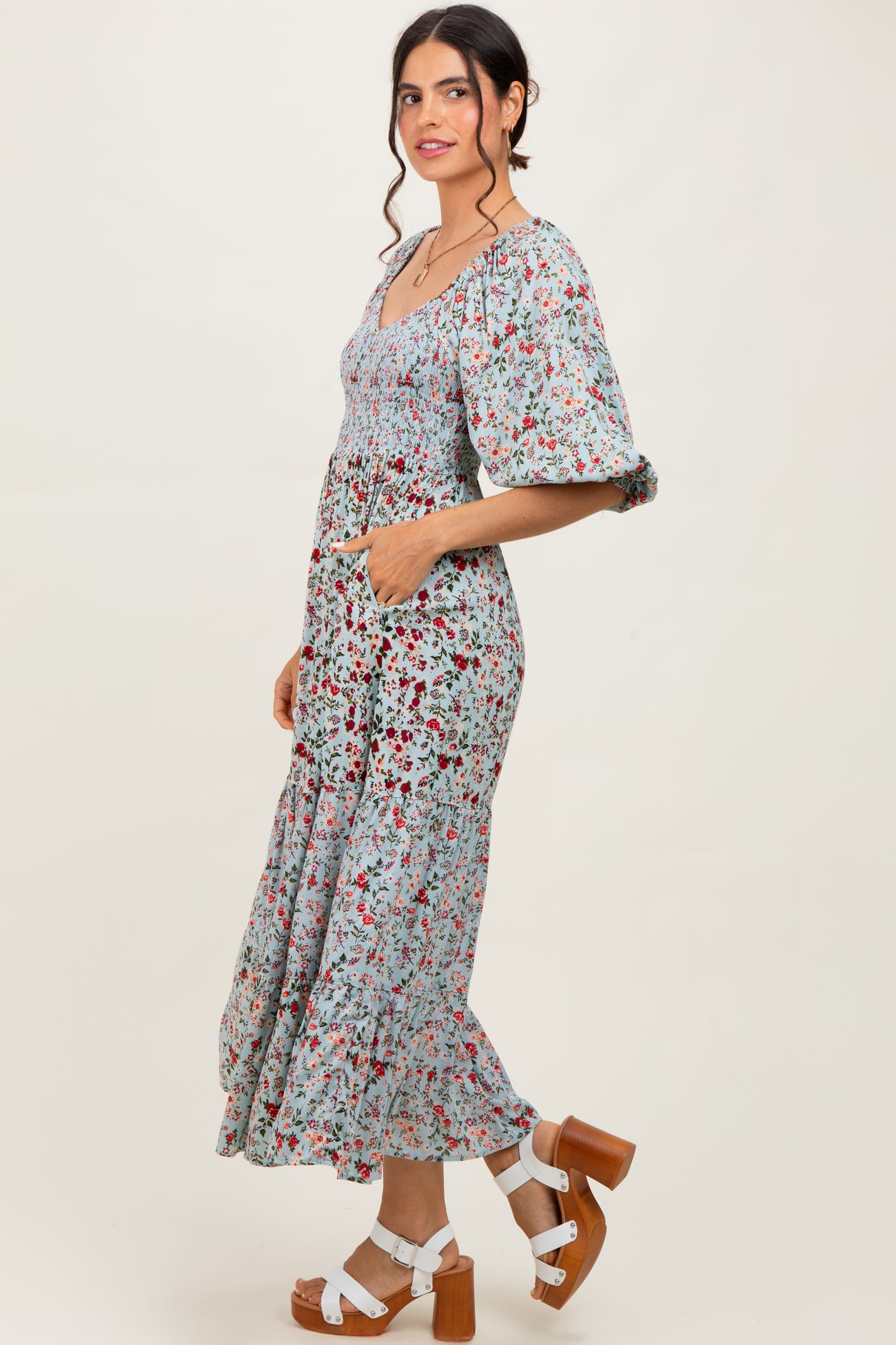Light Blue Floral Smocked Sweetheart Neckline Midi Dress