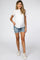 Details A pair of light wash, distressed maternity jean shorts featuring a frayed hem, five pockets, and an elastic belly band. Material has little stretch. Content + Care