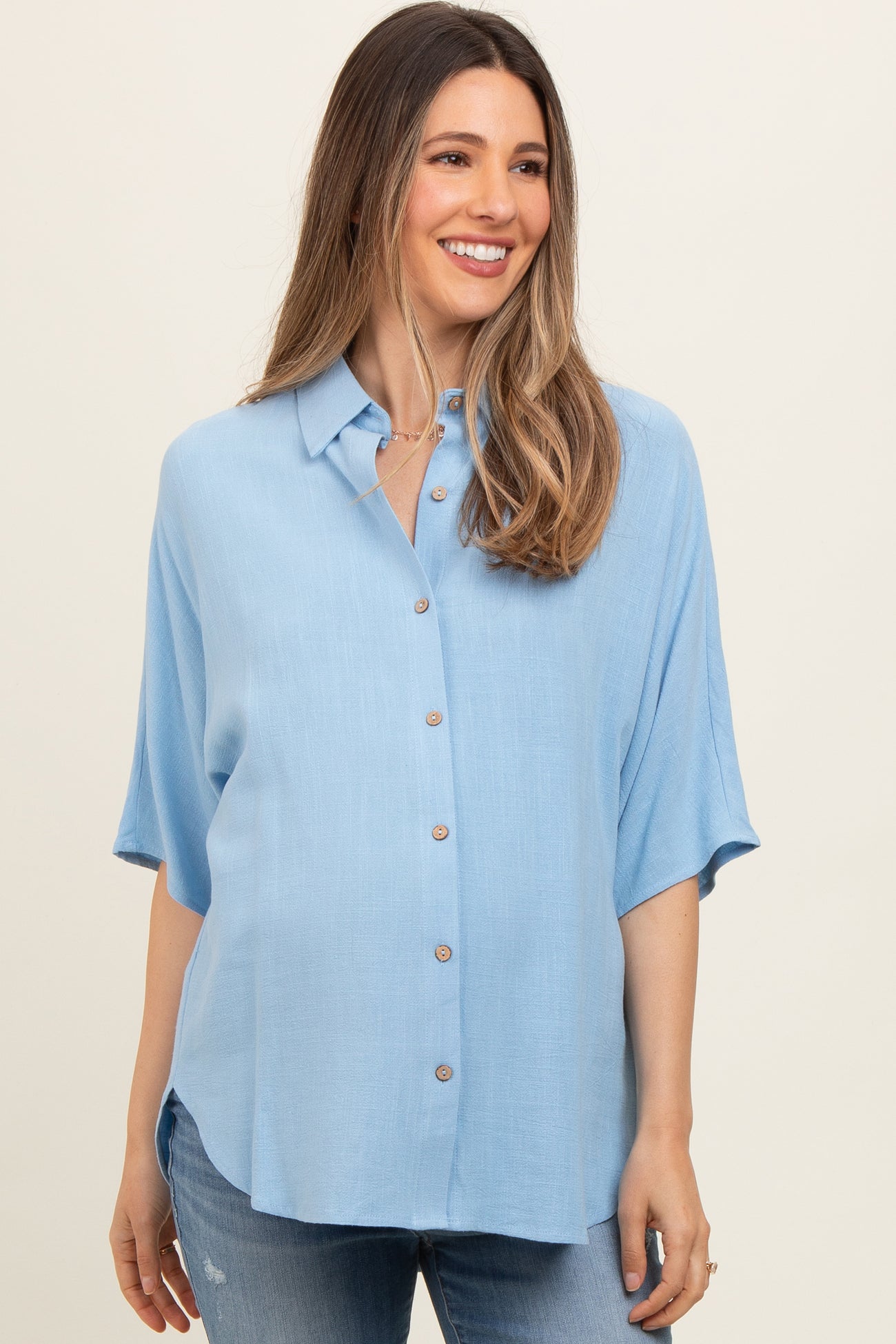 Light Blue Linen Dolman Half Sleeve Button Down Maternity Top