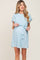 A pleated maternity dress with a rounded neckline, short flounce sleeves, a waist tie, and a back keyhole button closure.