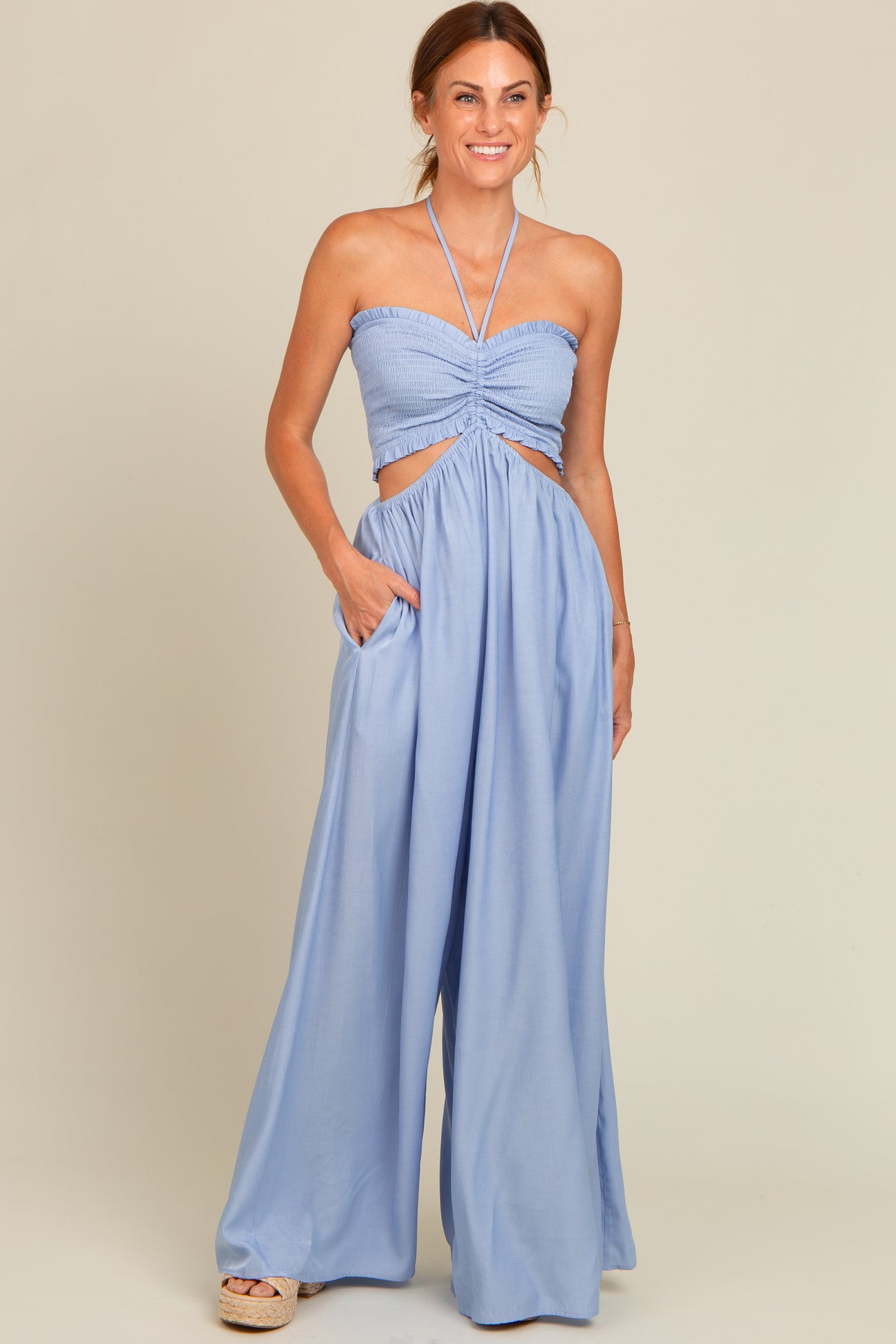 Light Blue Smocked Drawstring Halter Side Cutout Jumpsuit