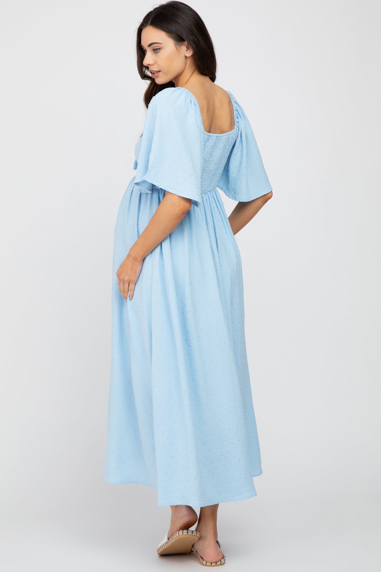 Light Blue Textured Dot Front Tie Ruffle Sleeve Maternity Midi Dress