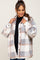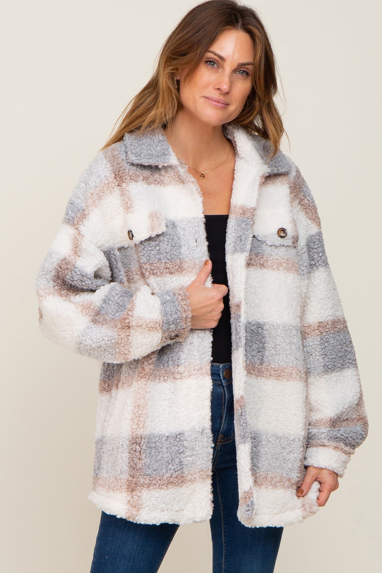 Details A plaid, textured maternity jacket. Features a collar, functioning front buttons, faux front pockets, long drop shoulder sleeves, and side pockets. Content + Care