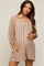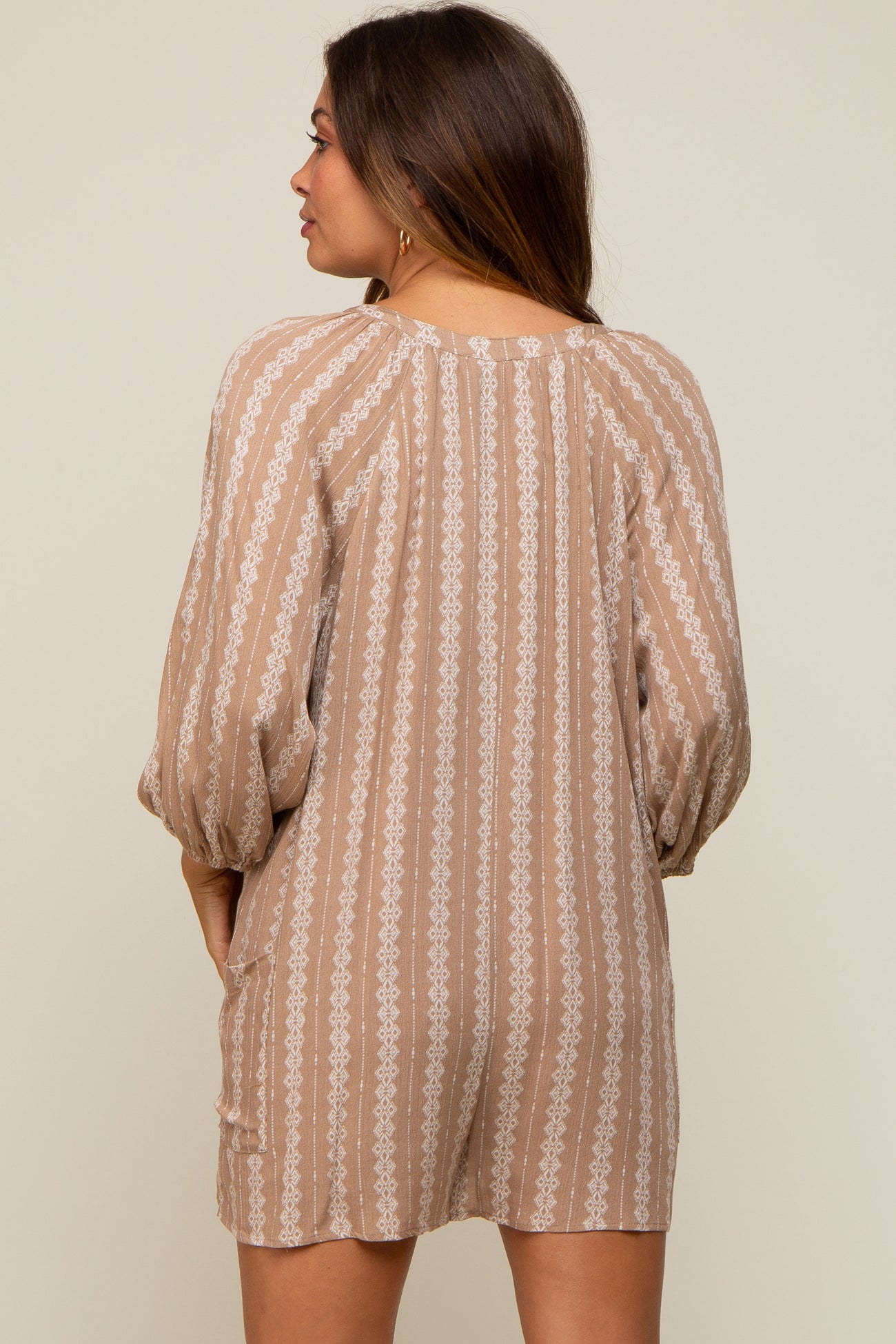 A printed maternity romper with front functioning buttons, a split v-neckline, 3/4 length sleeves, and side pockets.