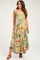 A floral maternity midi dress with a v-neckline, muti strap criss cross back, side pockets, and a rounded hem.
