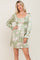 A floral printed satin dress featuring a v-neckline, a smocked elastic top, an empire waist and long bubble sleeves with smocked wrists.