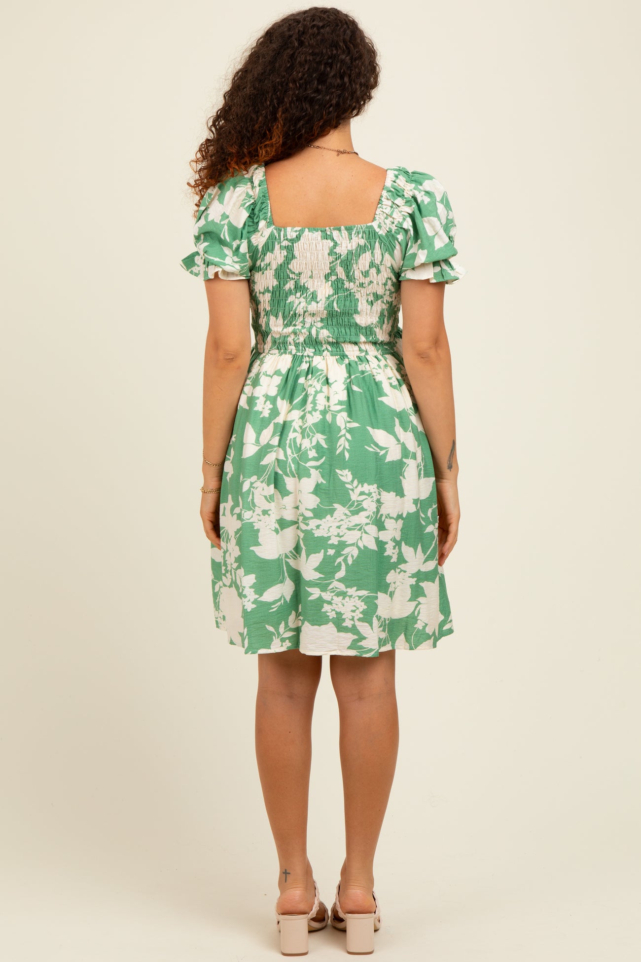 Light Olive Floral Smocked Puff Sleeve Maternity Dress