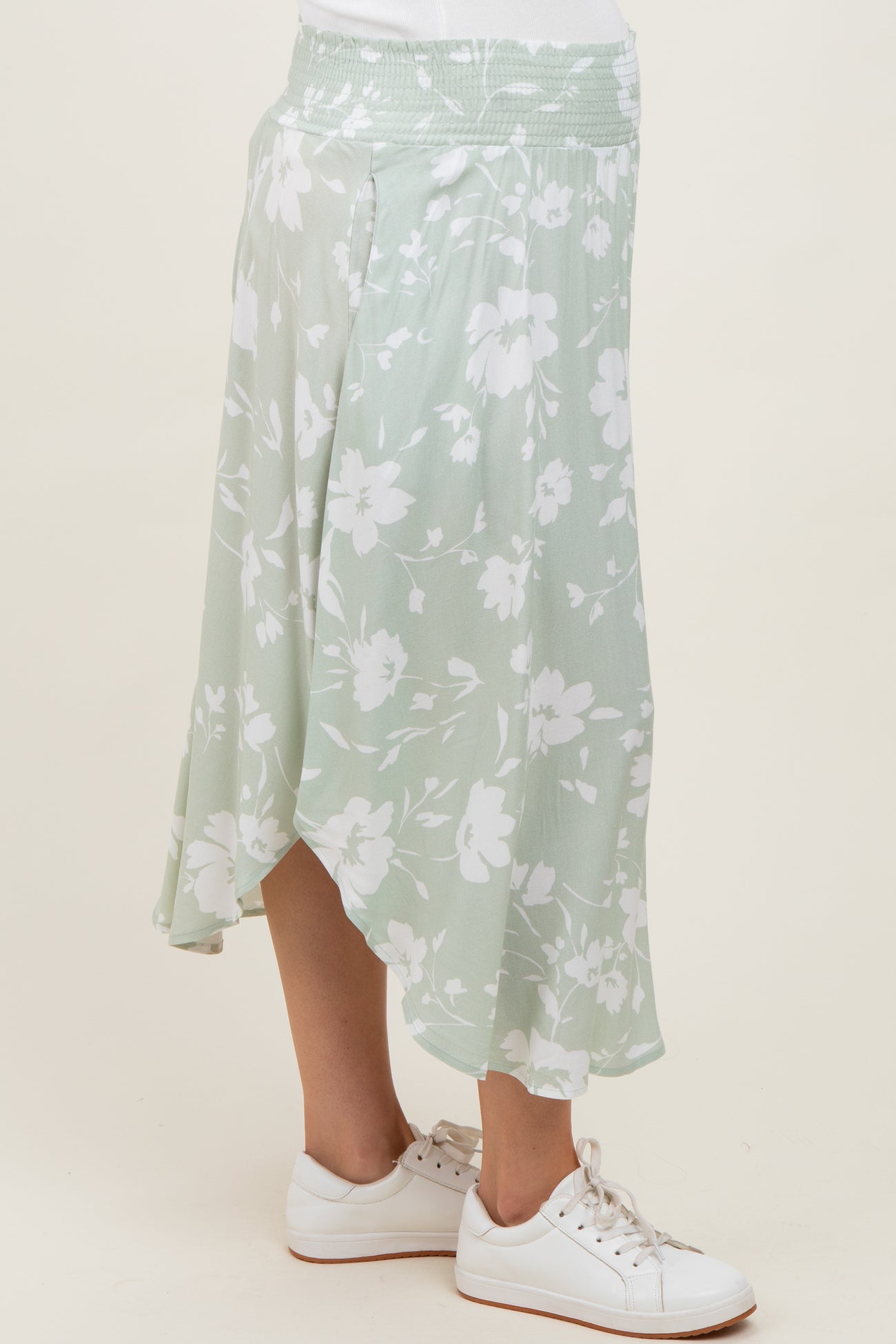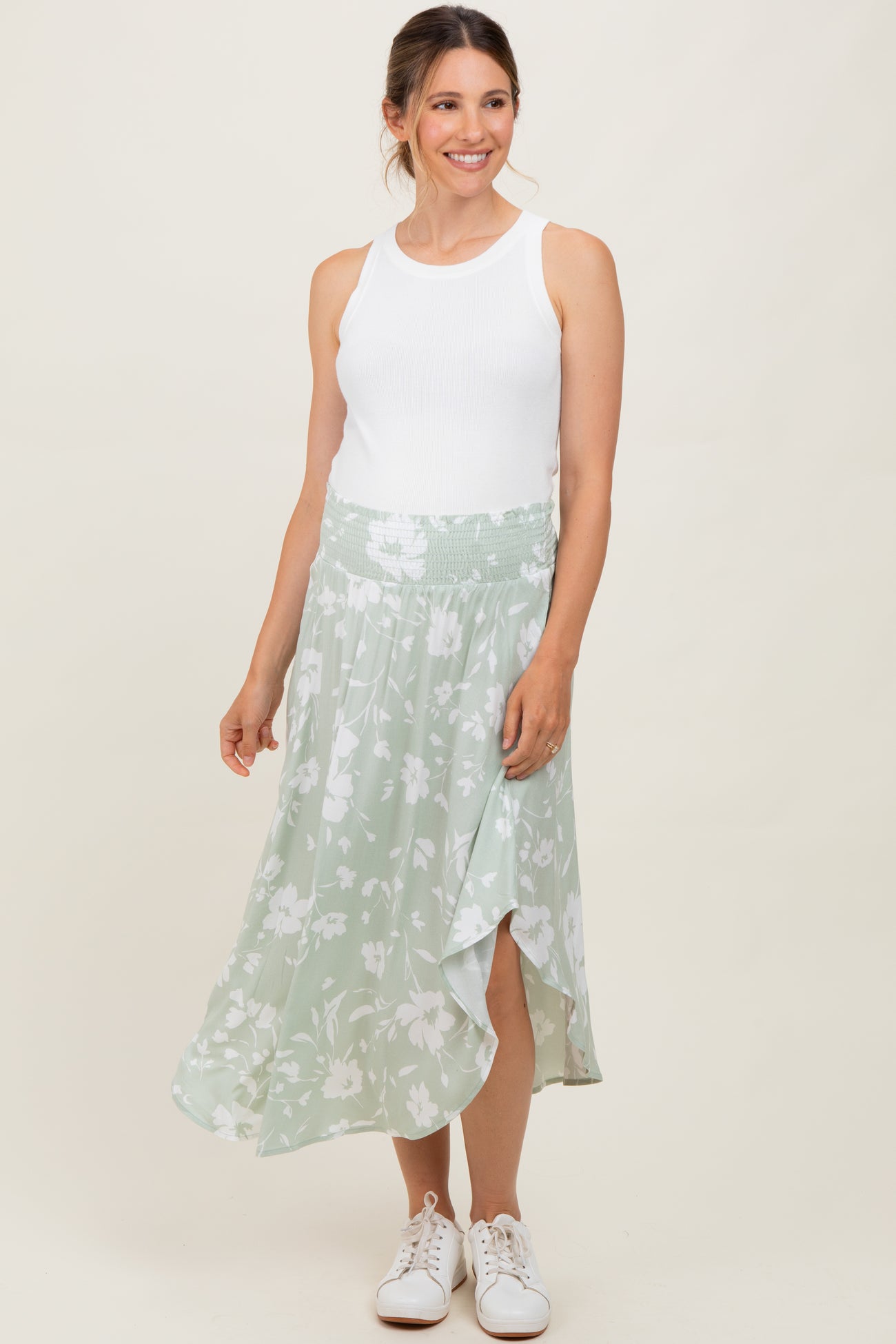 Light Olive Floral Smocked Waist Round Hem Maternity Midi Skirts