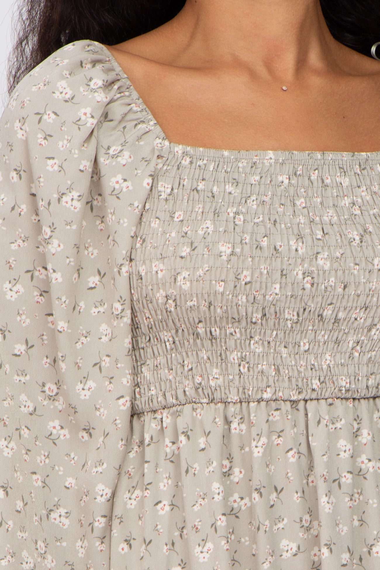 Details A floral midi dress featuring a squared neckline, long cinched sleeves, a smocked bodice, and a gathered bottom tier. Content + Care