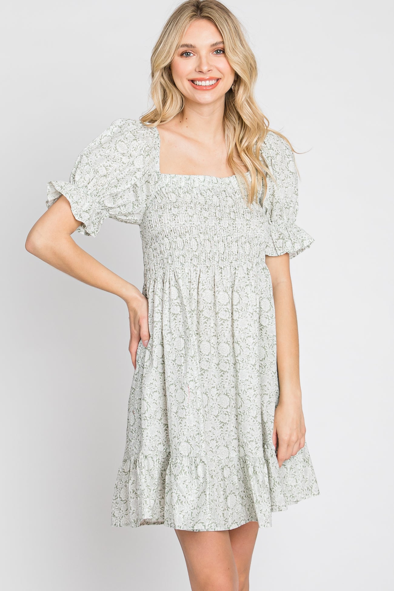 Light Olive Floral Square Neck Smocked Ruffle Hem Dress