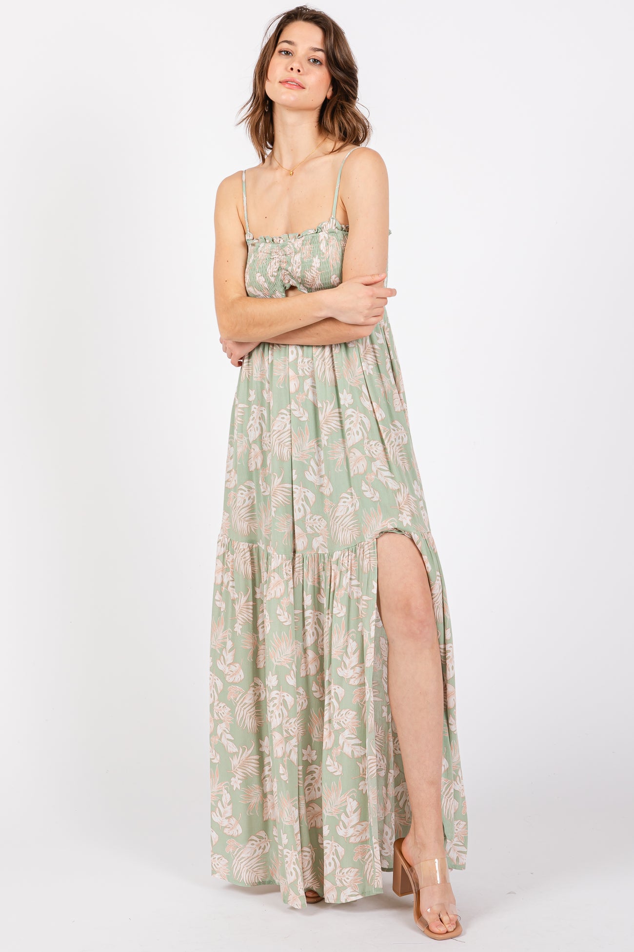 Light Olive Floral Sweetheart Smocked Front Cutout Maxi Dress