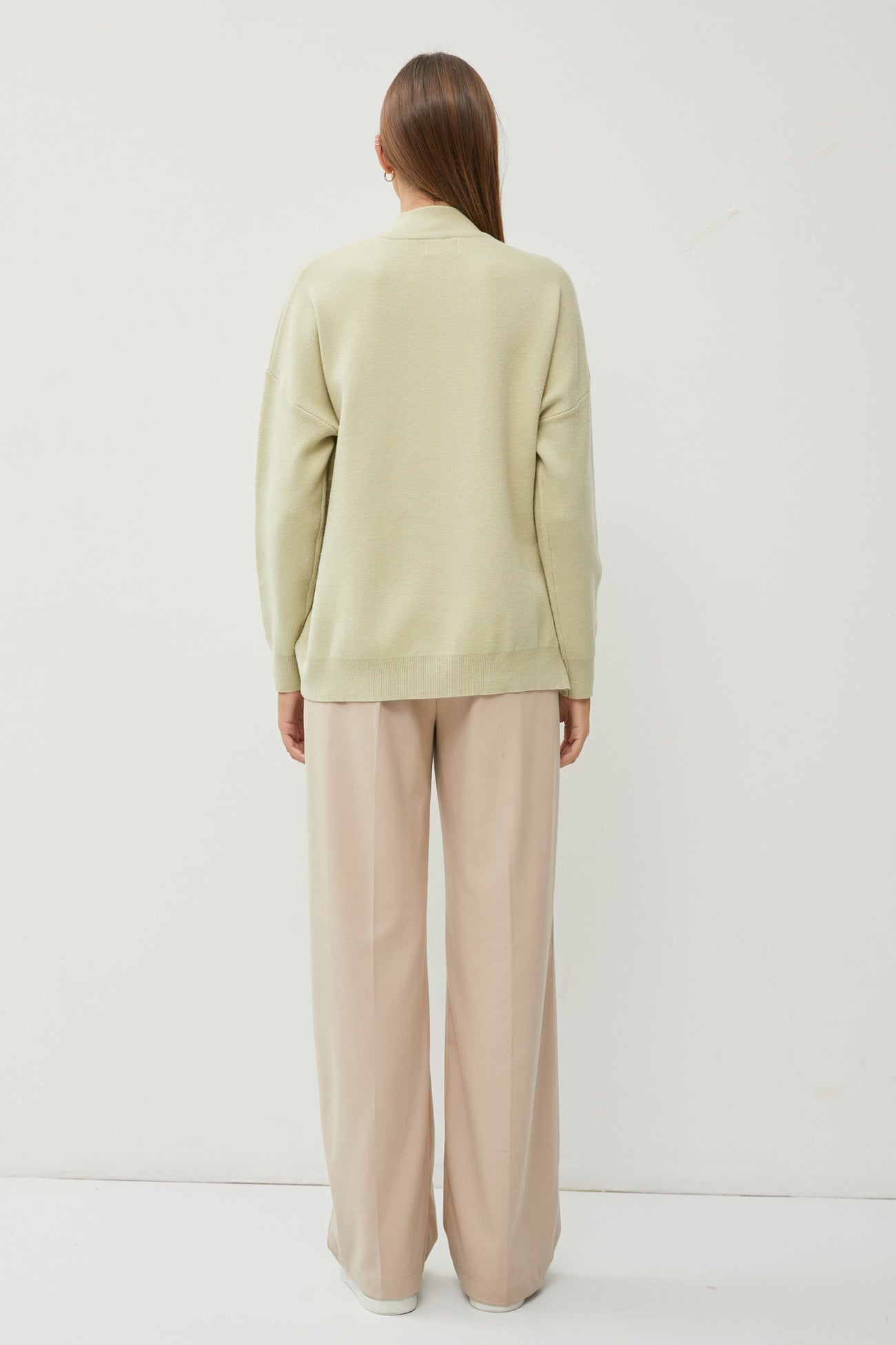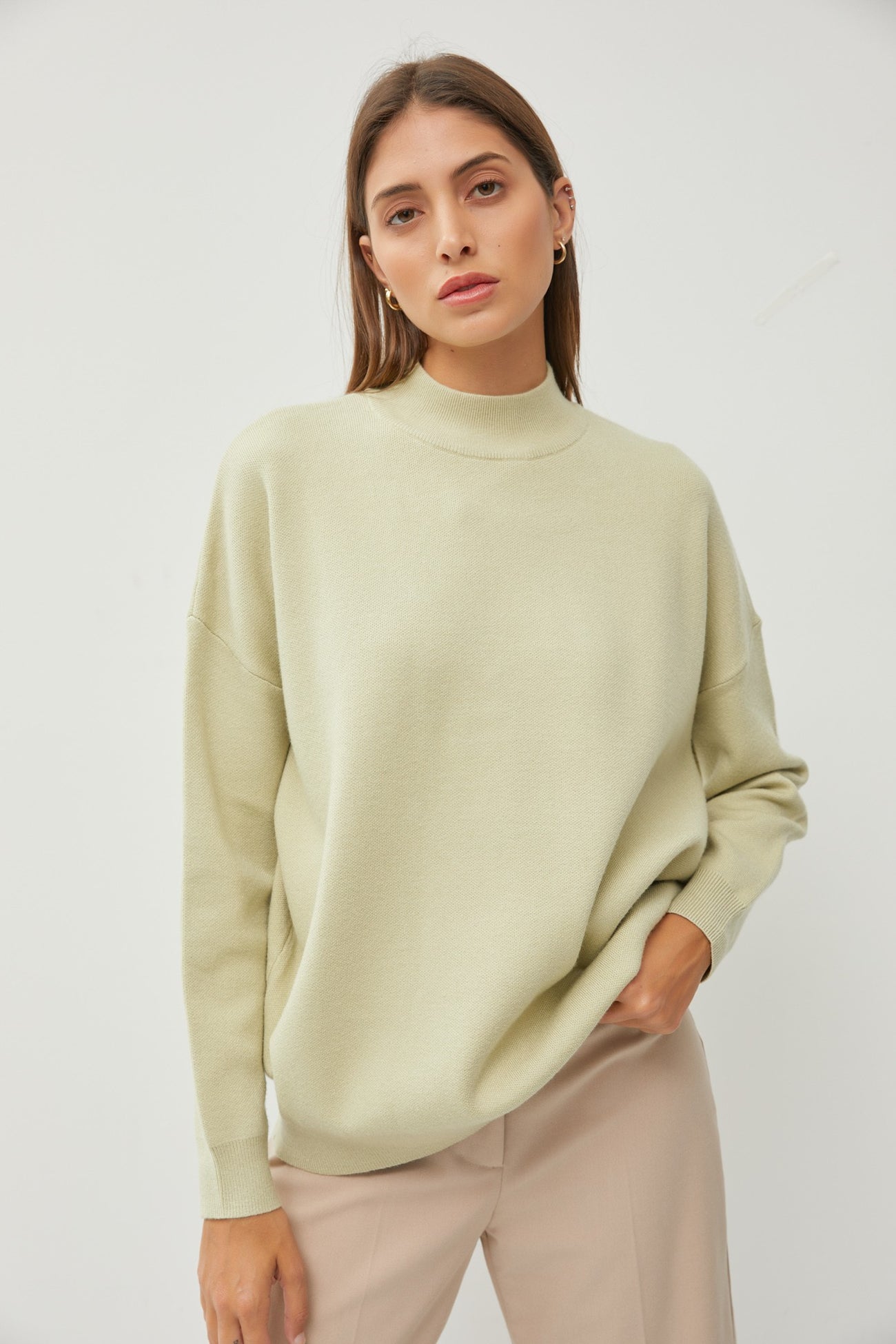 An ultra soft knit sweater featuring a mock neckline, long sleeves and a ribbed trim.