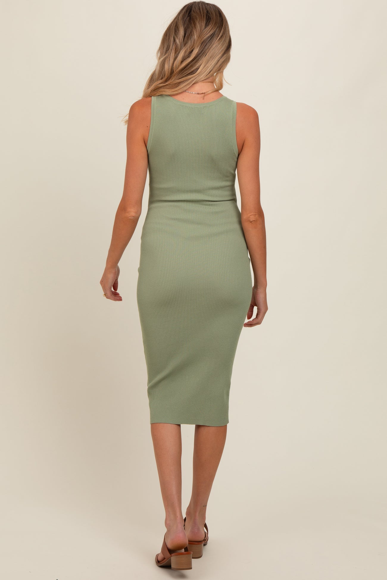 Light Olive Ribbed Fitted Sleeveless Snap Button Maternity Dress