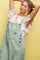 A pair of overalls with a squared neckline, adjustable straps, a front pocket, Side button closures, back pockets, a raw accent hem and distressing throughout.