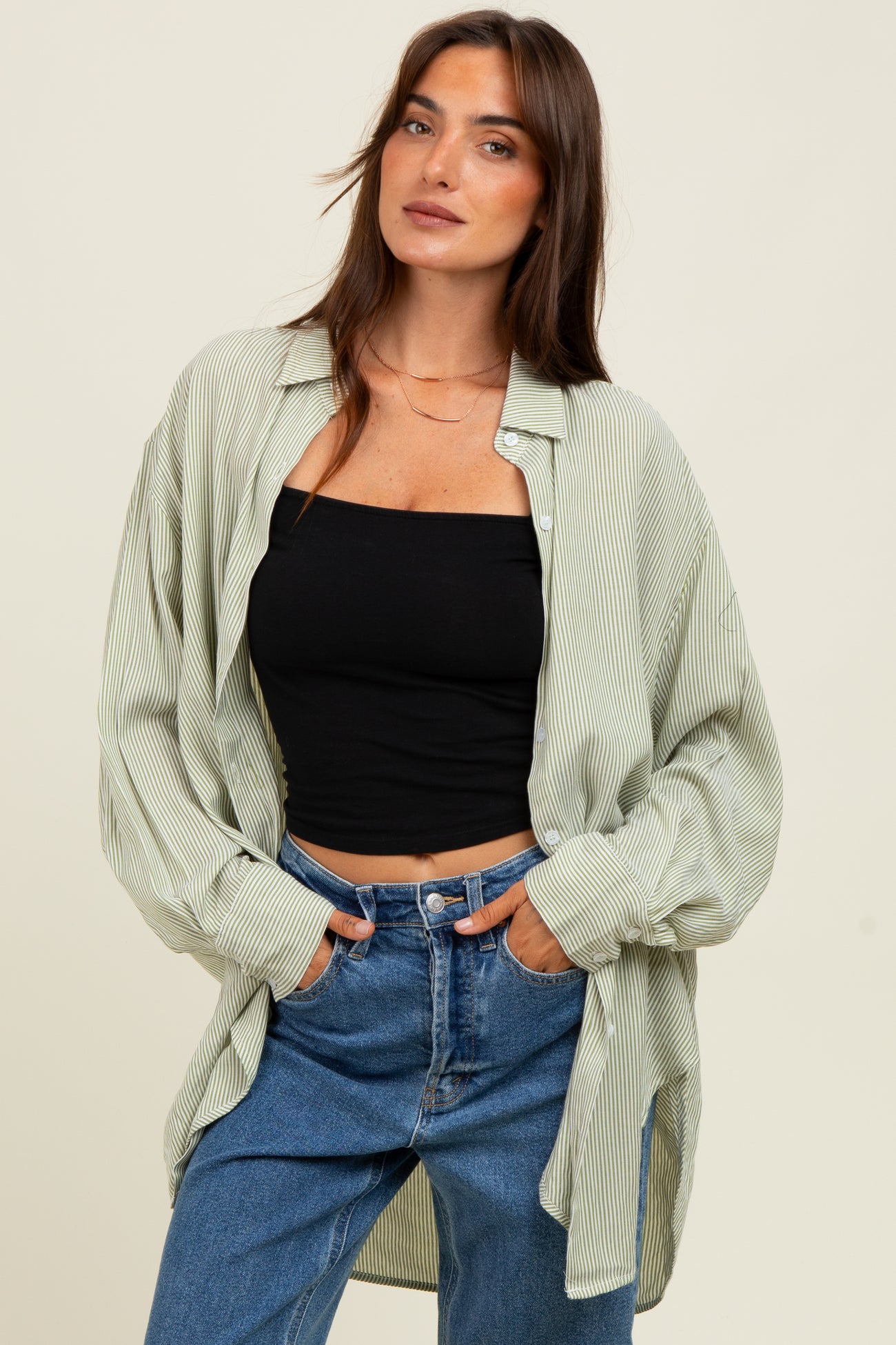 Light Olive Striped Oversized Button Down Shirt