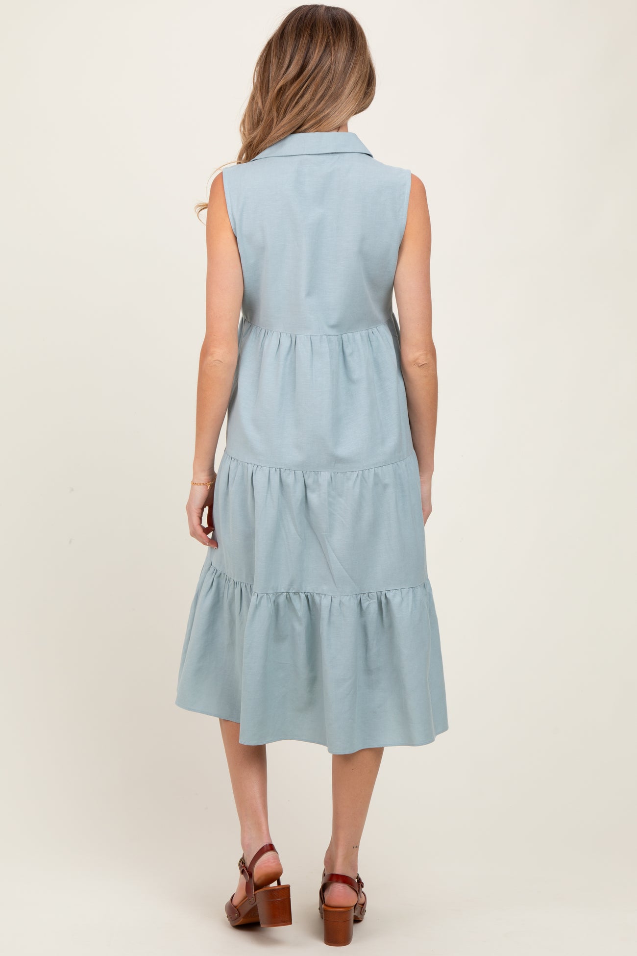 Light Olive Tiered Sleeveless Maternity Midi Shirt Dress