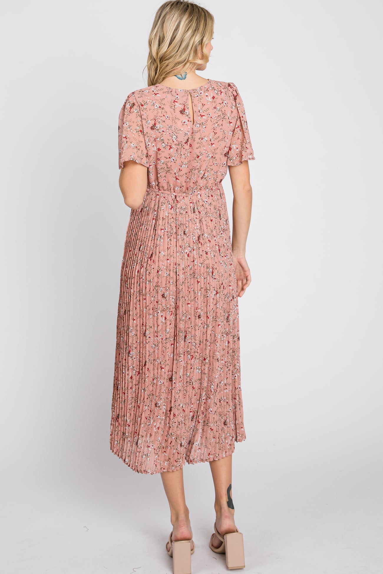 Light Pink Floral Pleated Short Sleeve Chiffon Midi Dress