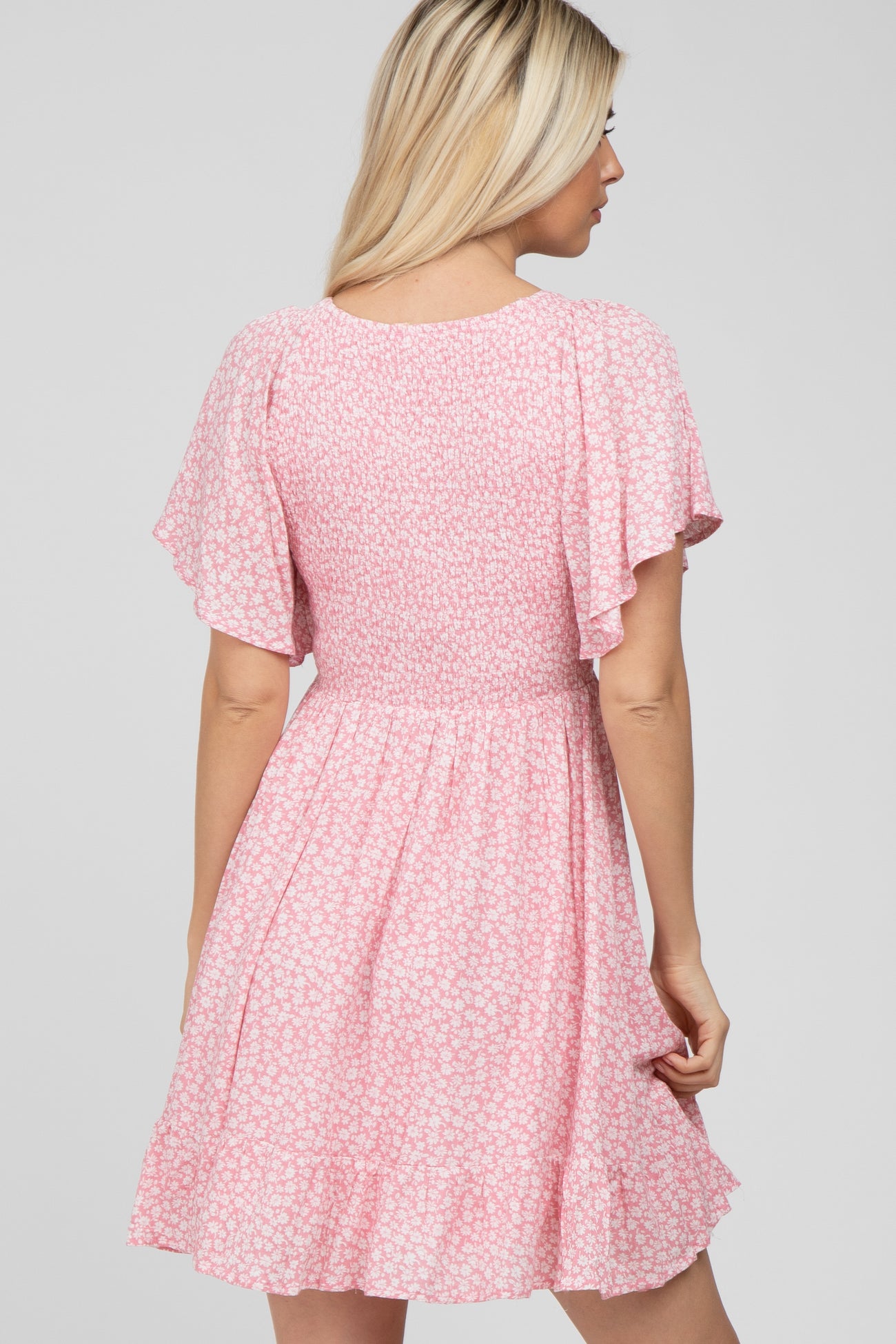 Details A floral print short dress with a smocked bust, v-neckline and ruffle sleeves and hemline. Dress is partially lined. Content + Care