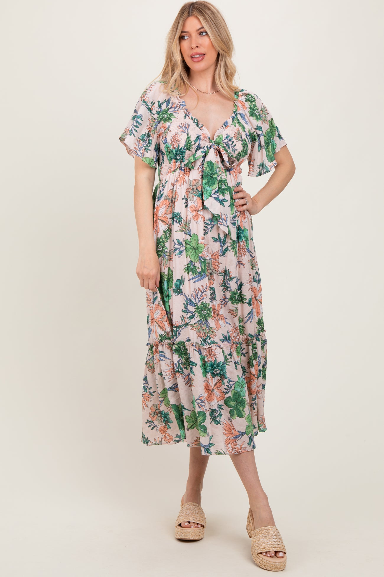 Embrace comfort and style with this floral print woven maternity midi dress, designed to celebrate your pregnancy journey. The flowy silhouette features an adjustable tie-front detail, allowing a customizable fit that grows with you. Lightweight fabric ensures breathability, while flutter sleeves add a delicate, feminine touch. The midi length offers versatility for casual outings or special occasions. Perfect for moms-to-be seeking effortless elegance combined with cozy wearability throughout all trimesters. Pair with sandals or flats for a chic, easygoing look.