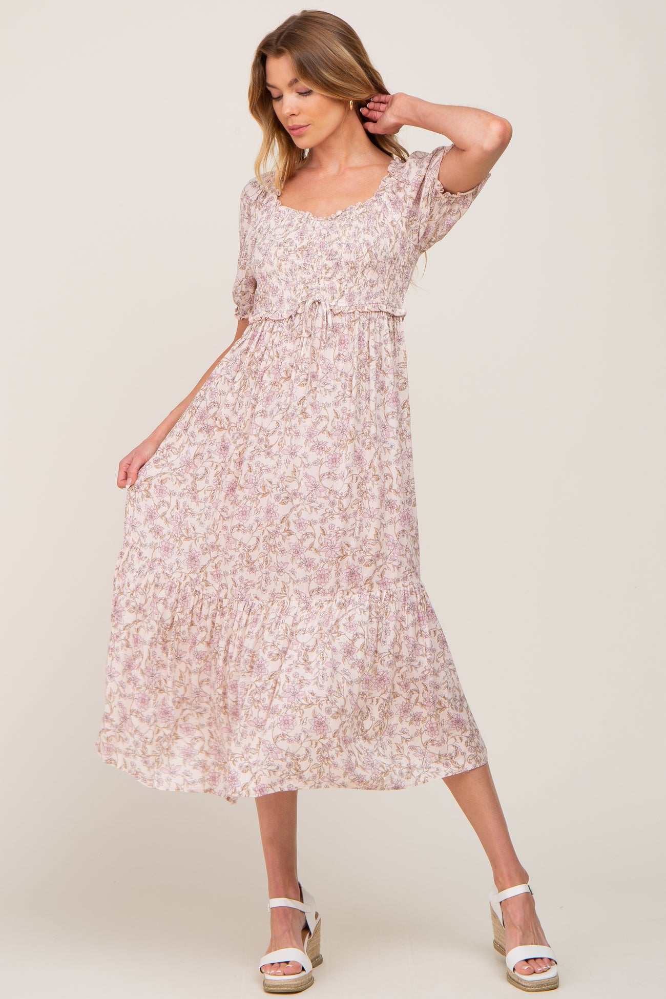 Light Pink Floral Smocked Sweetheart Neck Midi Dress