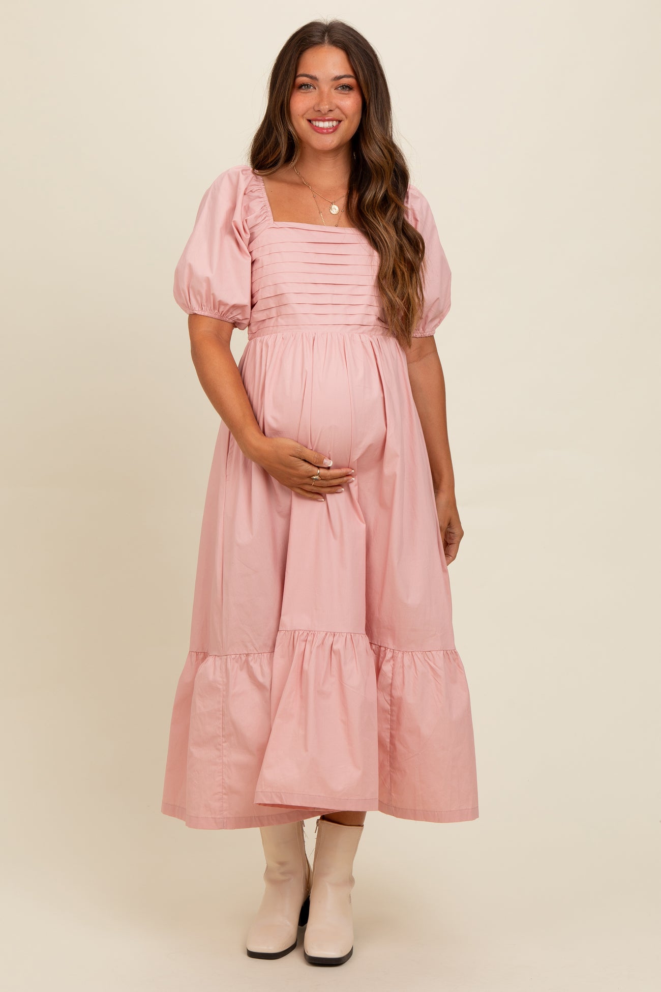 Light Pink Pleated Bodice Puff Sleeve Maternity Midi Dress