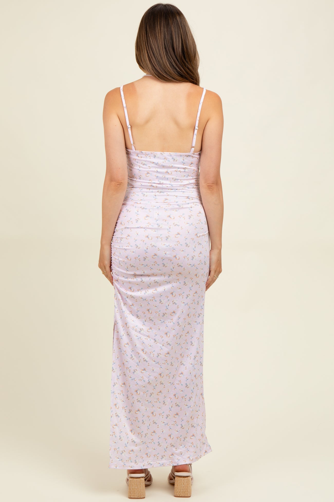 Embrace your pregnancy glow with our Light Pink Spring Floral Print Sleeveless Maternity Dress. Featuring a delicate floral pattern on a soft pastel pink background, this dress is designed to keep you comfortable and stylish throughout your pregnancy. The lightweight, stretchy fabric gently hugs your growing bump, while the sleeveless design and adjustable spaghetti straps provide a breezy, flattering fit. Perfect for spring outings, casual gatherings, or baby showers, this maxi dress offers effortless elegance with a side slit for easy movement. Elevate your maternity wardrobe with this must-have spring essential!