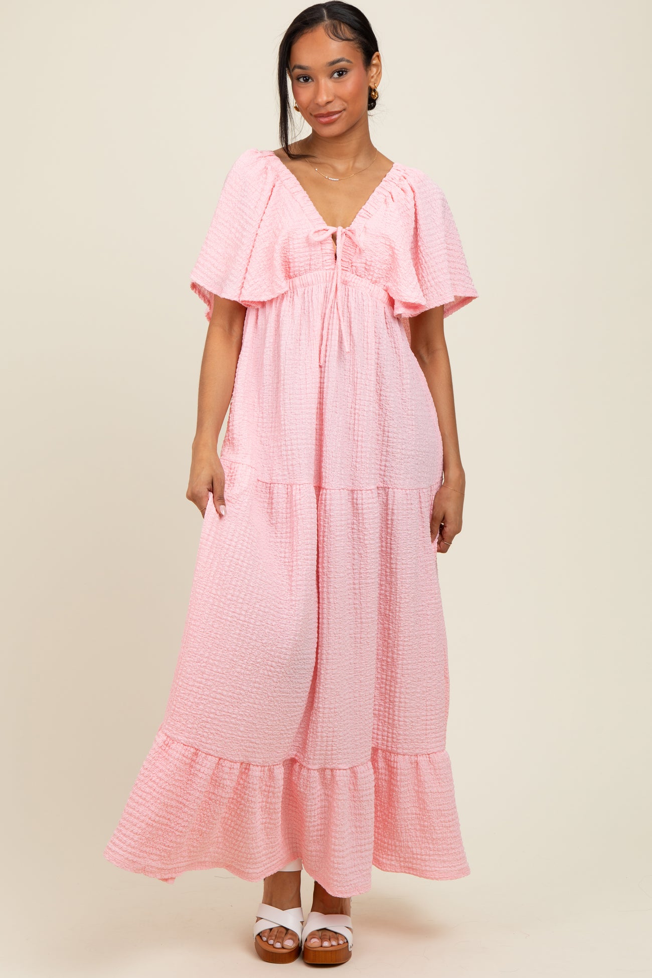 Light Pink Woven Textured Flutter Sleeve V-Neck Tiered Maxi Dress