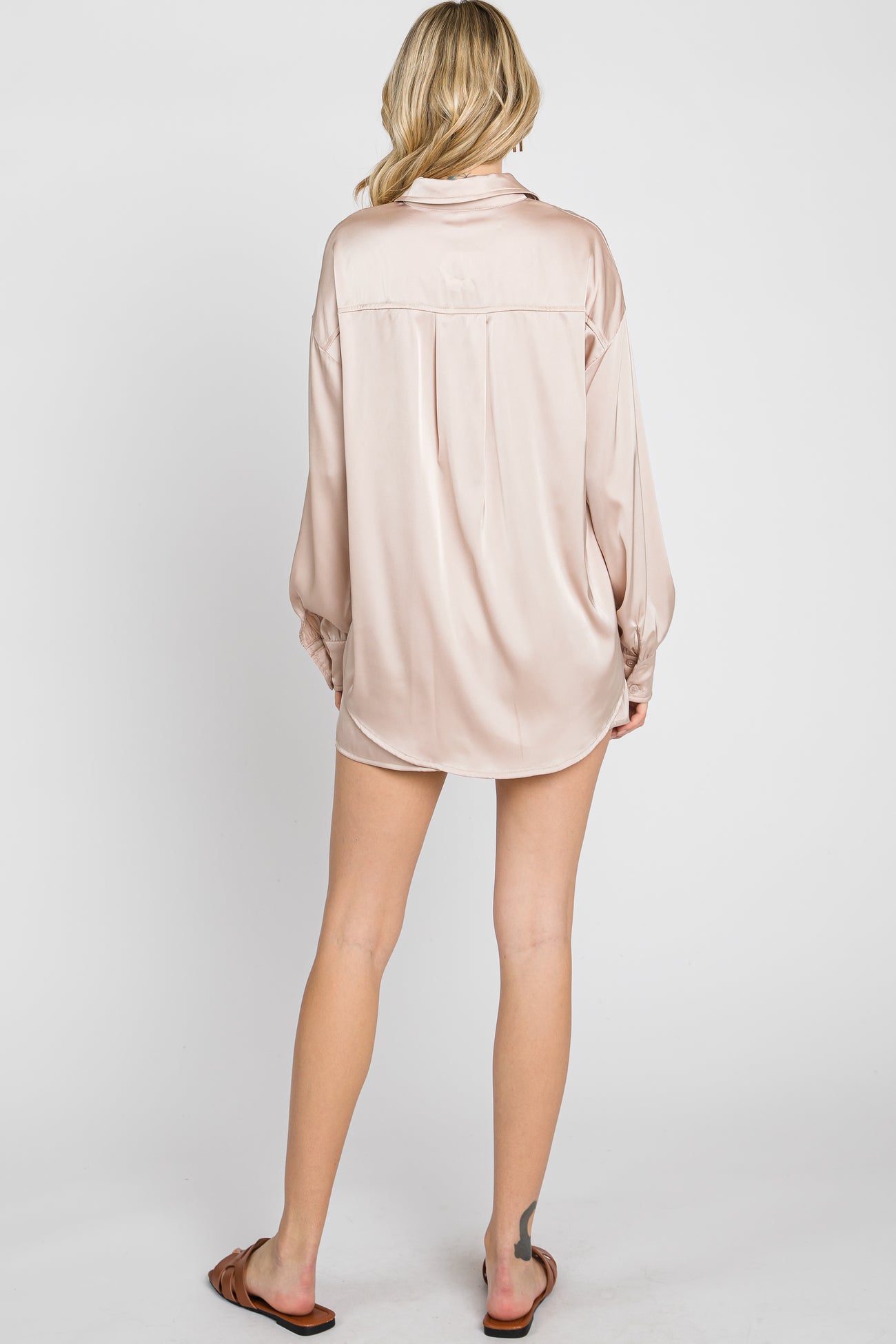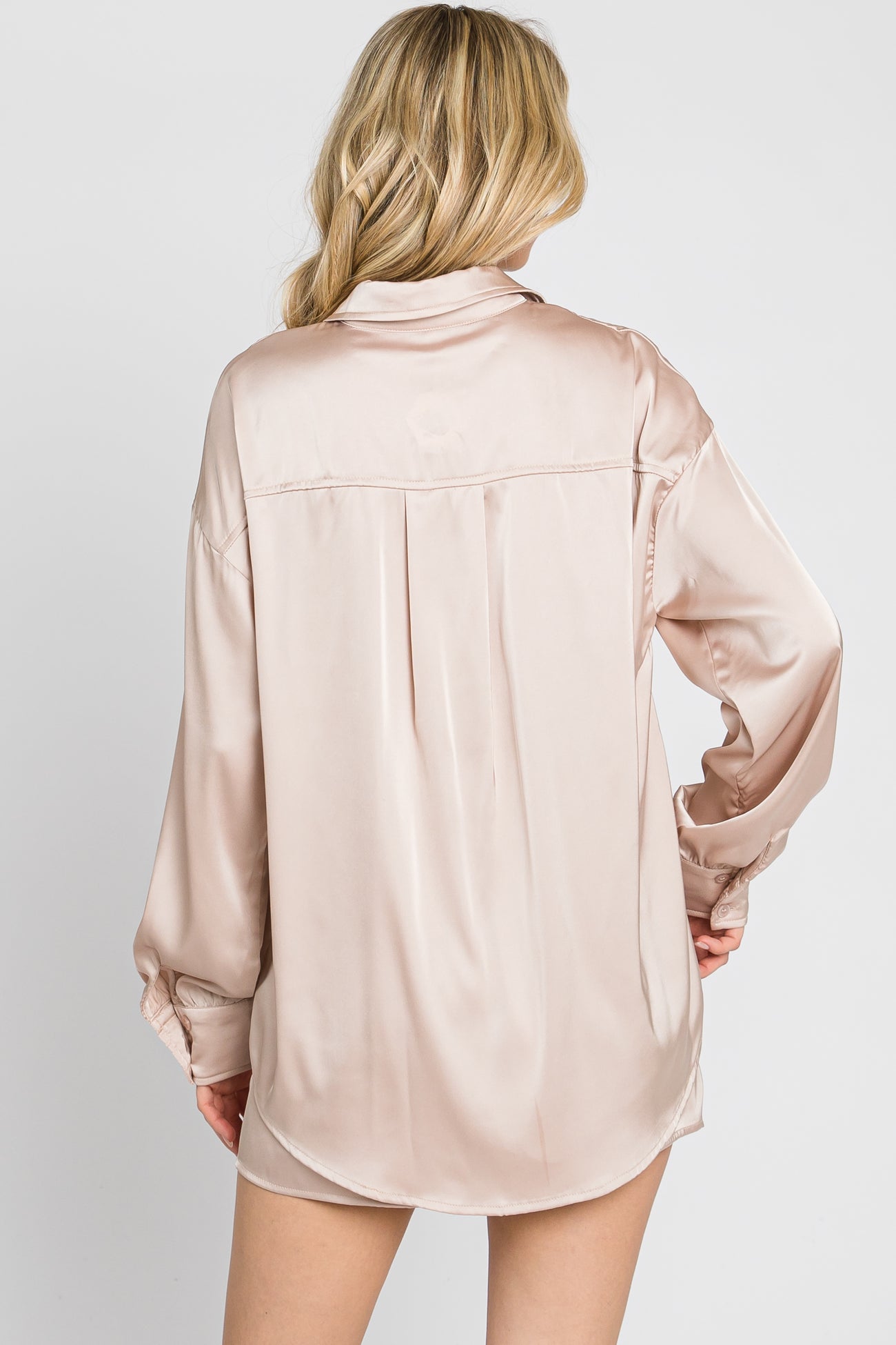 A satin set with a button up and shorts. The button up features a collar, long cuffed sleeves, and a rounded hem. The shorts feature a smocked elastic waist, a front tie, and front pockets.