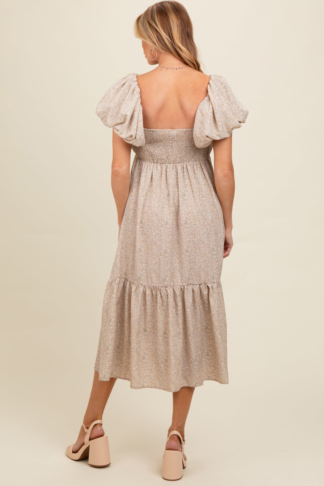 Light Taupe Floral Puffed Sleeve Maternity Midi Dress