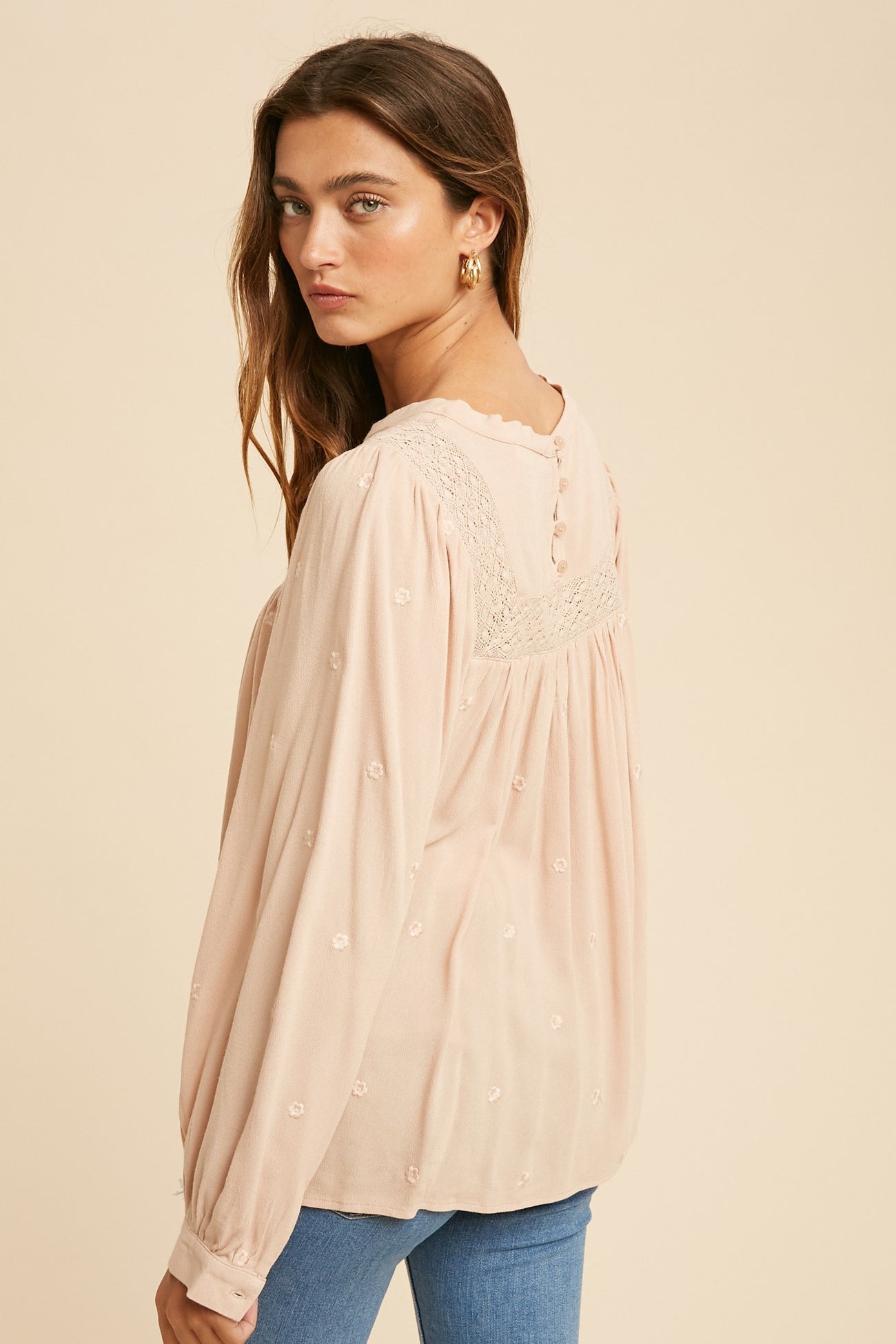 Light Taupe Lace Inlay Embroidered High Neck Blouse